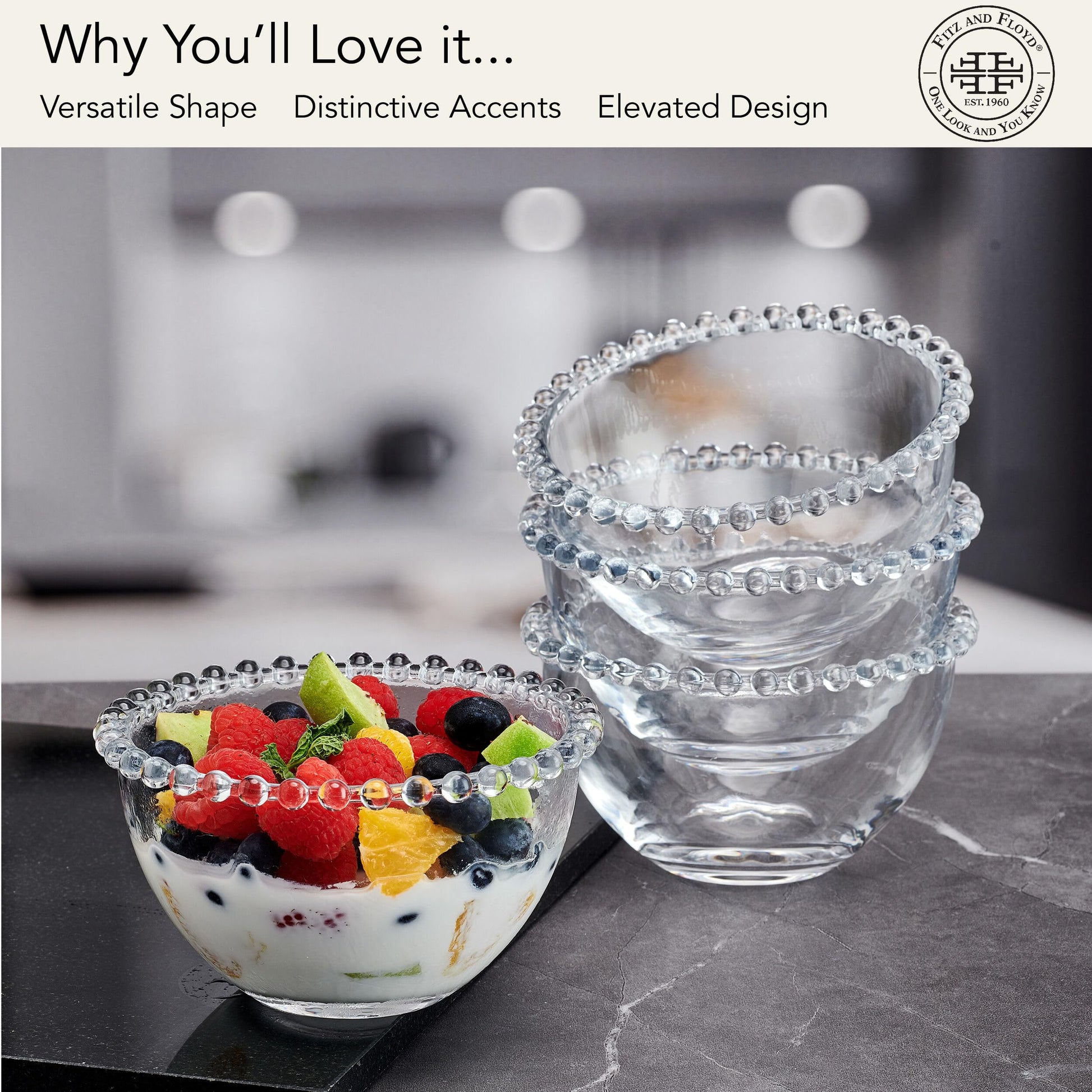 Details: This Set of 4 Beaded Serving Bowls by Fitz and Floyd makes a stunning statement on your tabletop and is perfect for serving a variety of sides or sauces. Made of glass with mesmerizing horizontal, beaded detailing around the rims, the elegant, eye-catching bowls are ideal for everyday enjoyment or for serving at formal gatherings. Each bowl measures 5-1/4 inches in diameter by 3-inches high with 14-fluid ounce capacity. Set of 4. Hand-wash with warm water and a mild detergent then rinse and dry immediately.