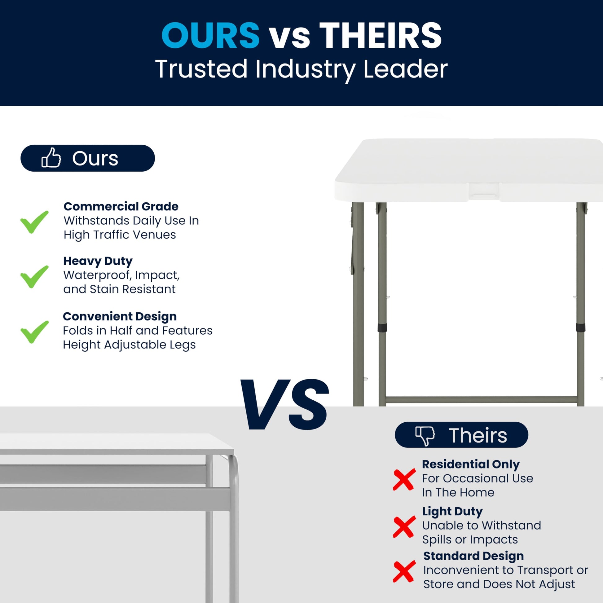 - HIGH-QUALITY CONSTRUCTION: Made with a 1.5" thick waterproof and impact and stain-resistant tabletop and durable gray powder-coated locking legs to withstand years of quality use at indoor and outdoor events