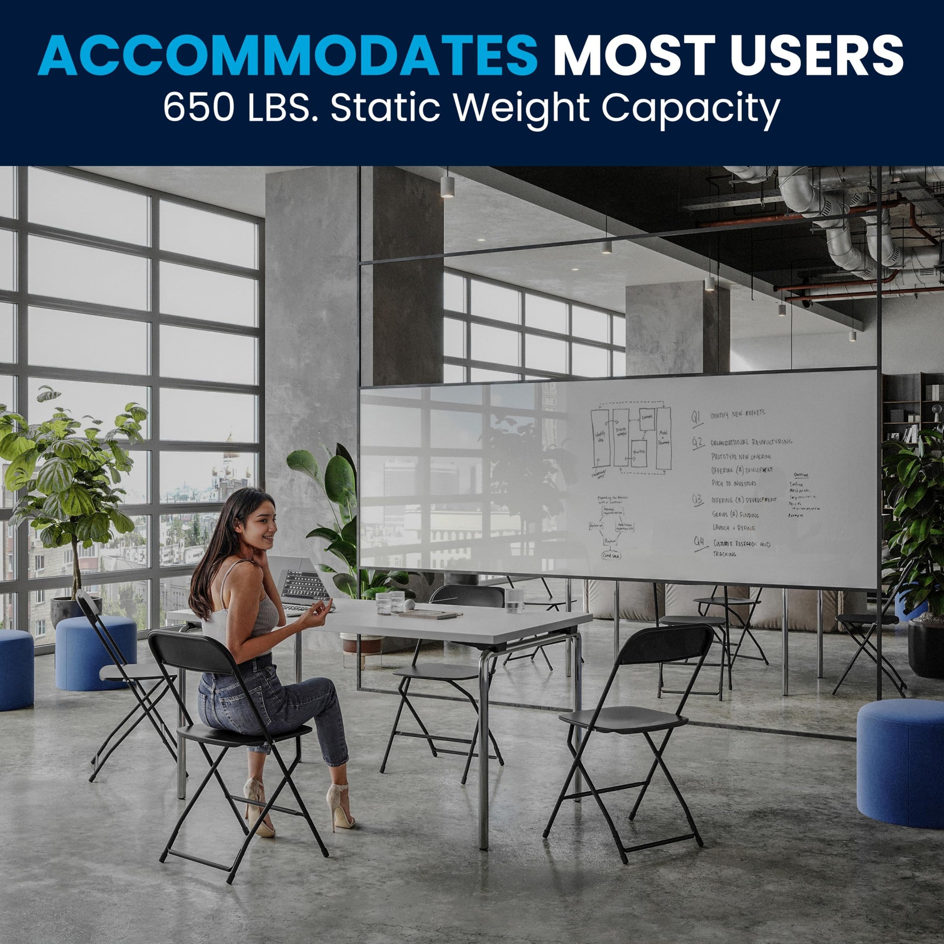 Details: Always be ready for your next event or get-together with this set of 10 folding chairs. Whether you're hosting a game night or catering event, planning weddings or business meetings, or organizing a school function, these black folding plastic chairs offer a reliable, on-demand seating solution for commercial or home use. The textured and contoured plastic seats with dry-assist drainage holes prevent water pooling in the event of rain. Made for portability and ease of use, the plastic chairs have an ultra-lightweight design and feature floor caps that protect flooring surfaces. The chairs can also be nested horizontally for a stack quantity of up to 50 chairs high from the floor or vertically in closets or sheds. With a combination of double-support braces and 18-gauge steel frames, these small folding chairs support up to 650 pounds of static weight and withstand years of quality use at indoor or outdoor events. Each event chair measures 17.5" W x 18" D x 31.5" H open with a 15.5" W x 15.5" D x 17.75" H seat, 17.5" W x 15.5" H back, and 17.5" W x 2.5" D x 38.25" H folded with no assembly required.