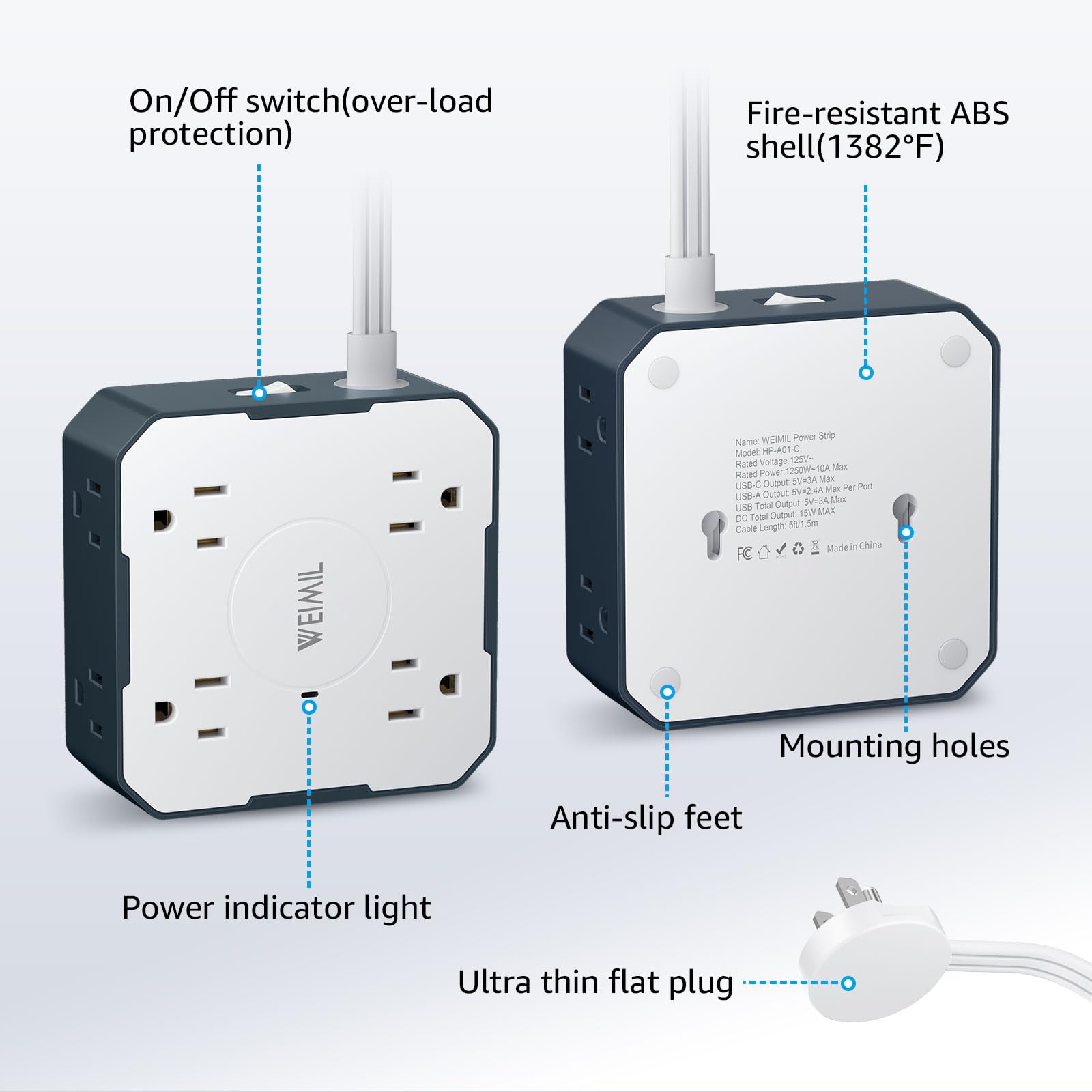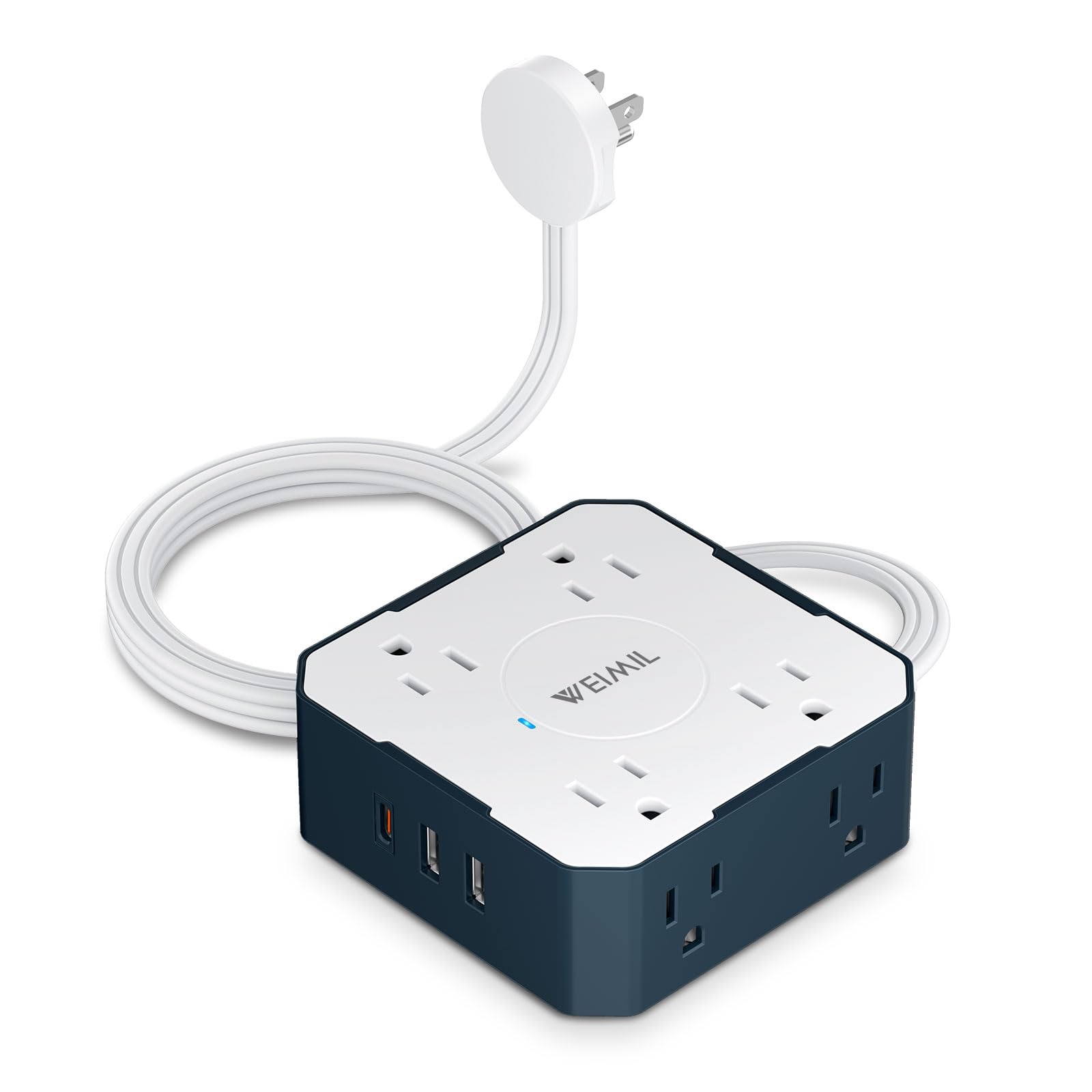 Details: Flat Plug Power Strip Surge Protector, WEIMIL 5Ft Ultra Thin Flat Extension Cord, 8 Widely Outlets with 3 USB Ports(1 USB C), Wall Mount for Travel Home Office Dorm