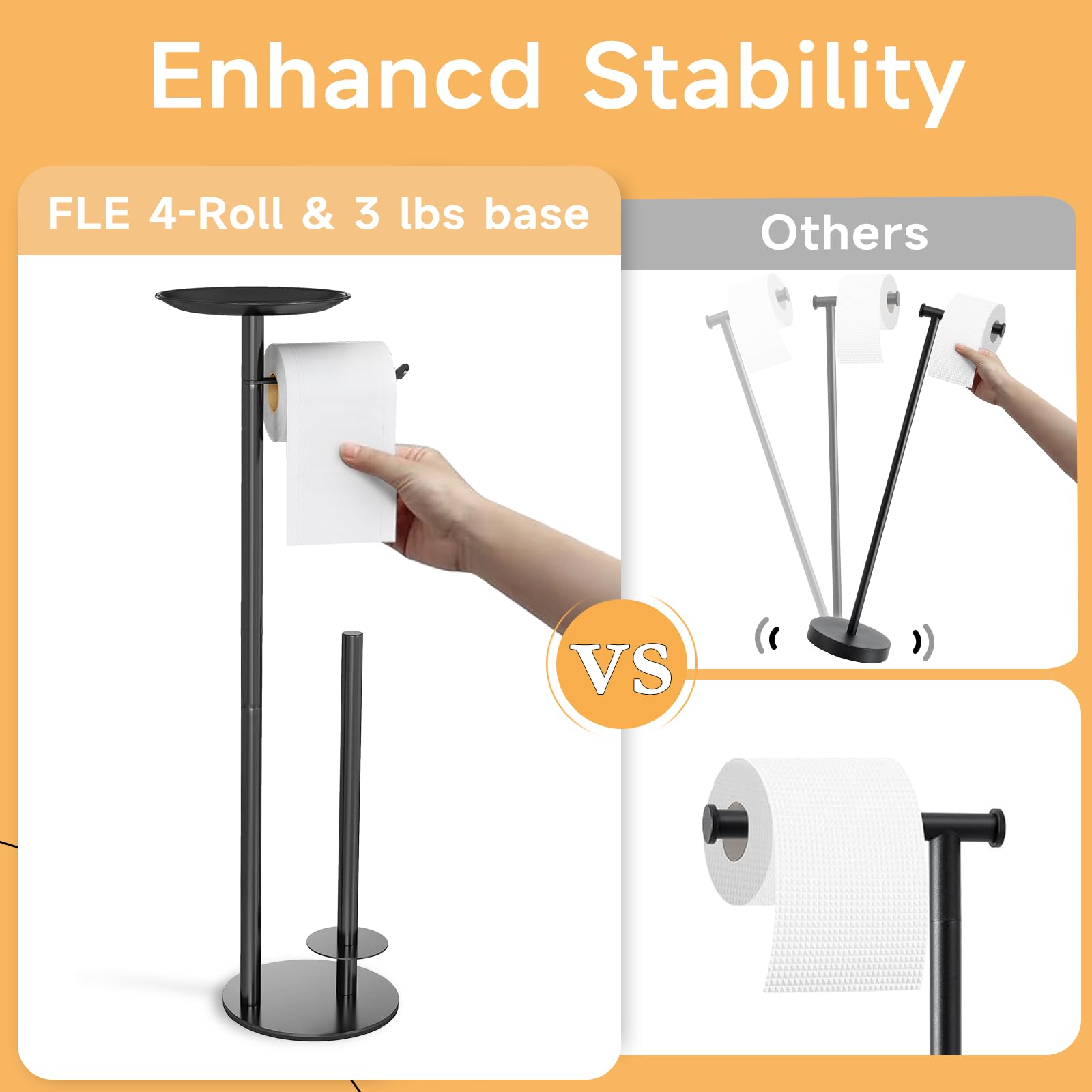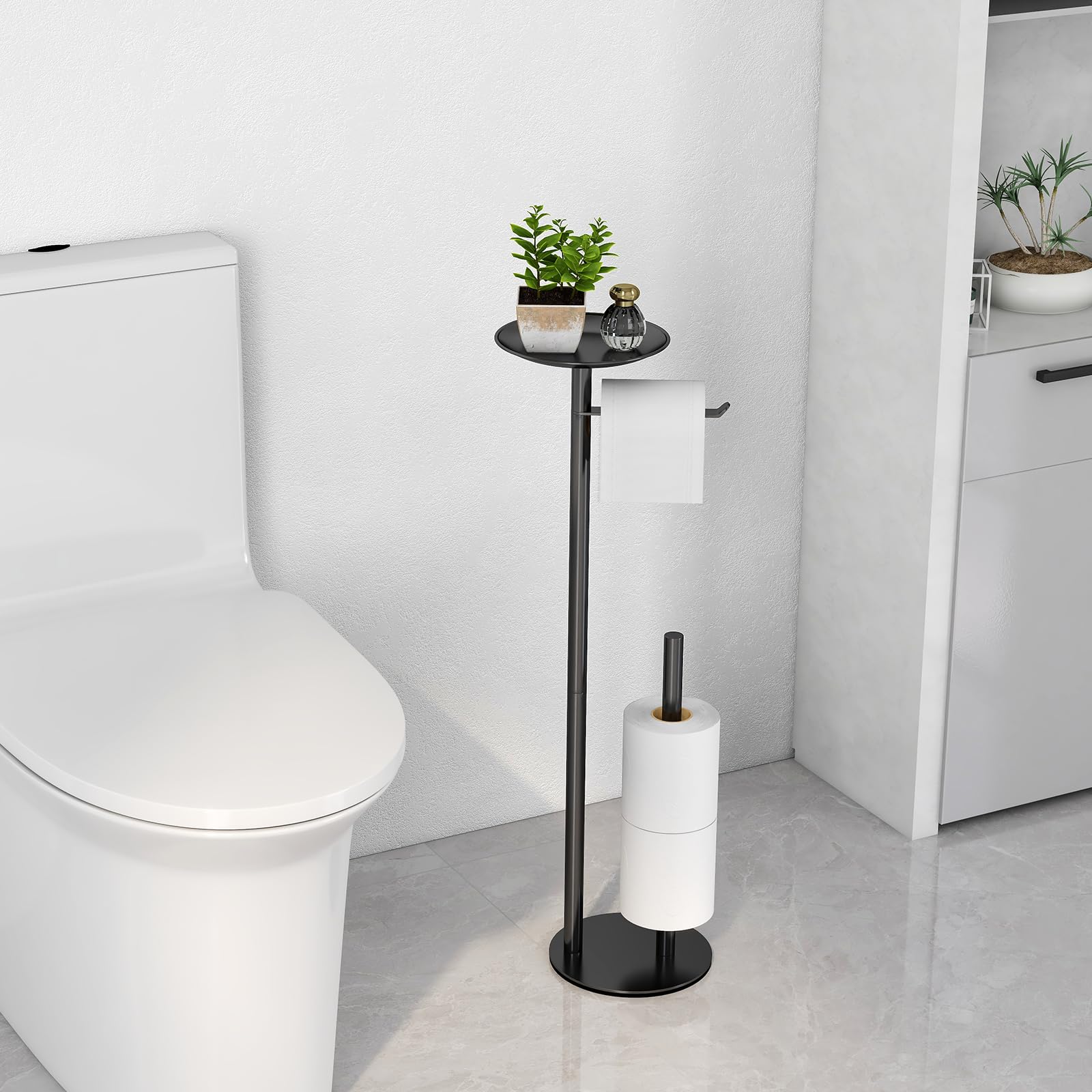 - 【Heavy Duty Base & Heightened Shelf】Up to 3lb base is an important factor to keep the standing toilet paper holder stable. The non-slip rubber pad at the bottom to make it more stable. Besides, the heightened shelf effectively keeps the paper rolls from getting wet or dirty