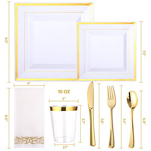 - 【HEALTH AND QUALITY】Disposable Dinnerware Set is safe for you and your guests!Our Gold Rim disposable square plates are made of 100% food grade plastic,BPA free.The high-quality dinner plates and salad plates offers reliable strength and durability,ensure won't scratch or break easily.