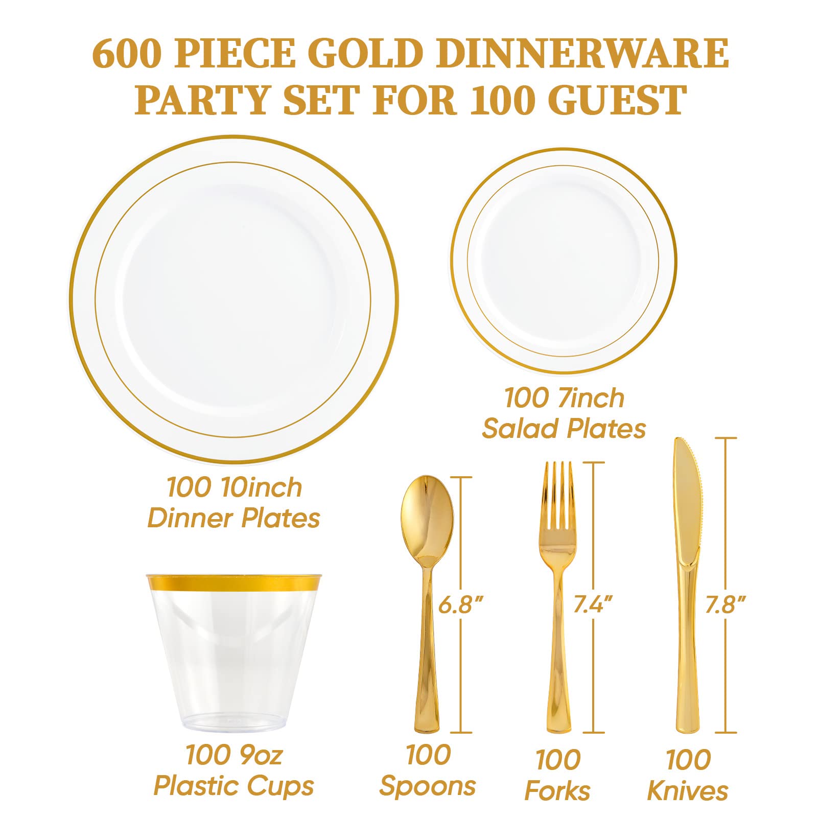 - Gold dinnerware set is safe for you and your guests! Disposable dinnerware set is made of 100% food-grade plastic, BPA free