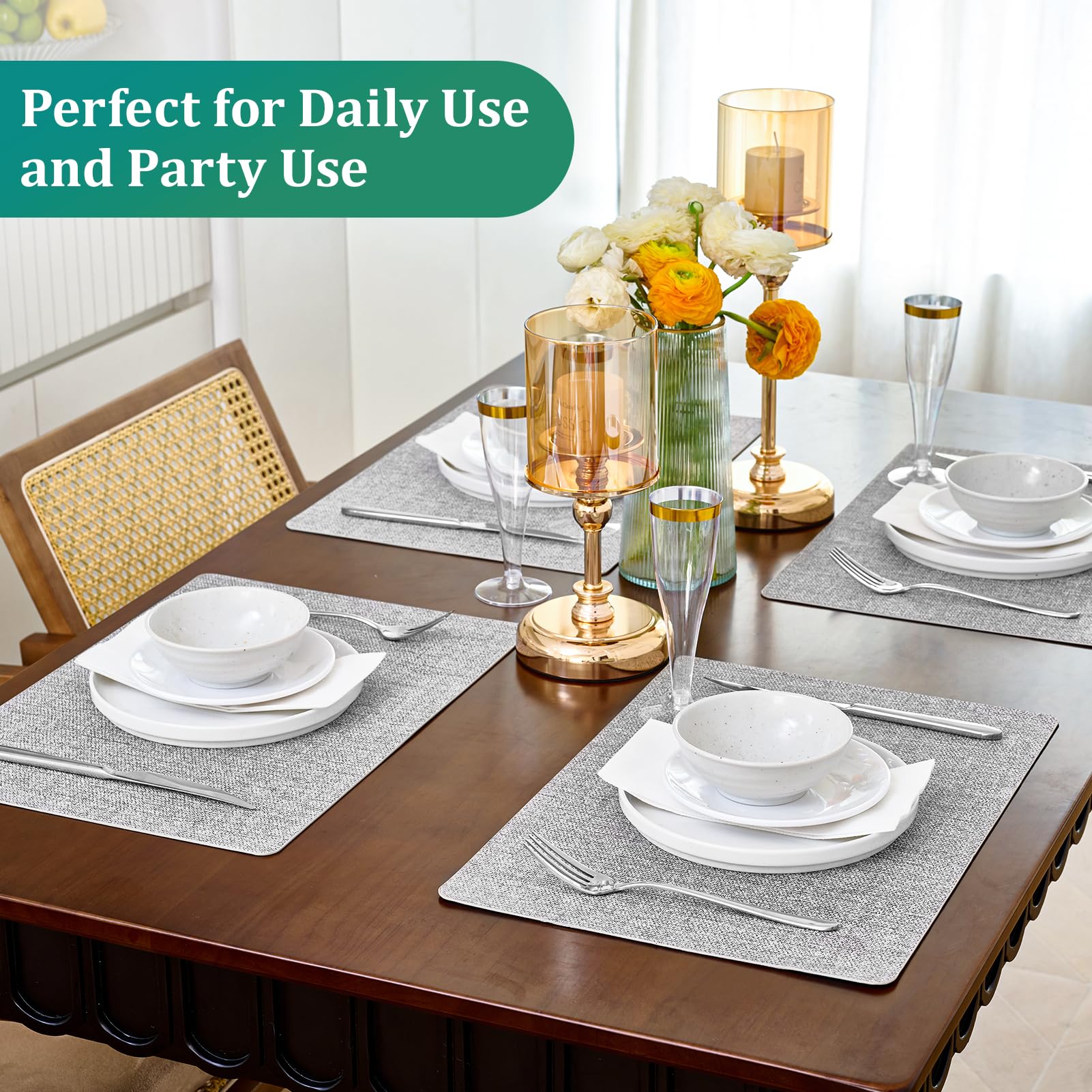 - Premium Quality: FOCUSLINE placemats are crafted from durable faux leather, designed to withstand the rigors of daily use. This versatile material is double-sided, wear-resistant, and built to last, making it a stylish and practical choice for any table setting