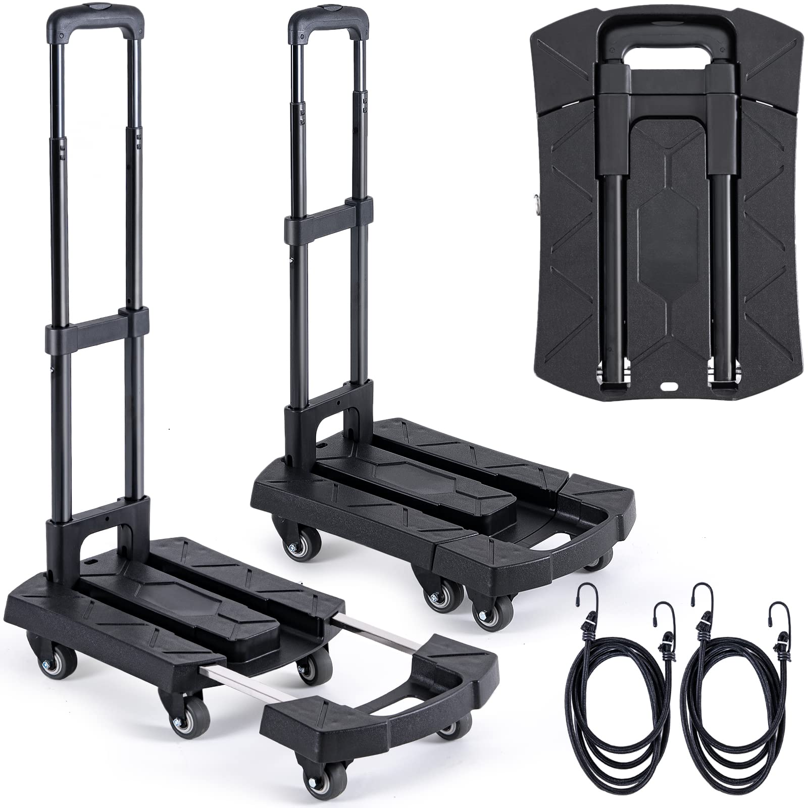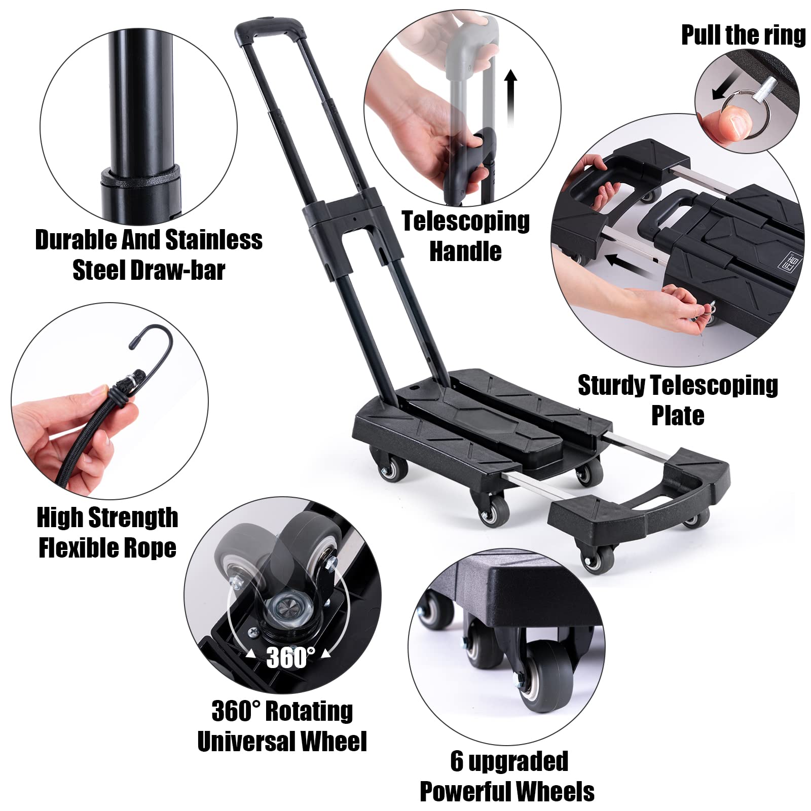 Folding Hand Truck Portable Dolly Cart Max 350 lbs Aluminum Foldable Dolly Cart Luggage Trolley Cart, 6 Wheels Push Cart Dolly for Moving, Small Platform Hand Cart with 2 Ropes Black