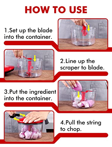 - Efficient Manual Food Chopper - Equipped with Japanese 420 stainless steel blade, our pull string chopper is ultra sharp for chopping veggie up. This pull chopper changes the chopping way, pulling string one time equals at least knife cuting 20 times and scraper included, rotating with the blade helps food can be chopped again evenly. Only a few pulls make it all done. Saving lots of time!