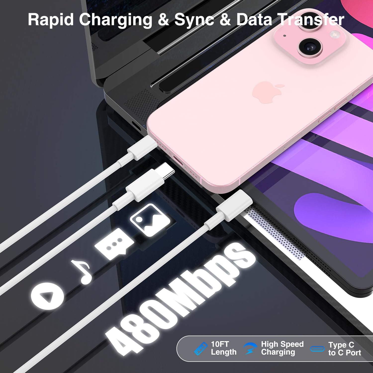 - 【60W USBC to USB C Cable for iPhone 15 Charger】60Watt USBC for iPhone 15 Charger Cord 10 Ft Extra Long Cord (60W/3.0A) USB C for iPad Charger Cable high speed USB C to USB C Cable compatible for iPhone 15 Series, for iPhone 15Pro/for 15Plus/for 15 ProMax, for iPad Pro 12.9/11 inch /Mini/Air,and more usb-c enabled devices. No more trigger warning messages and supports 480Mbps when used for charging,syncing or data transfering.