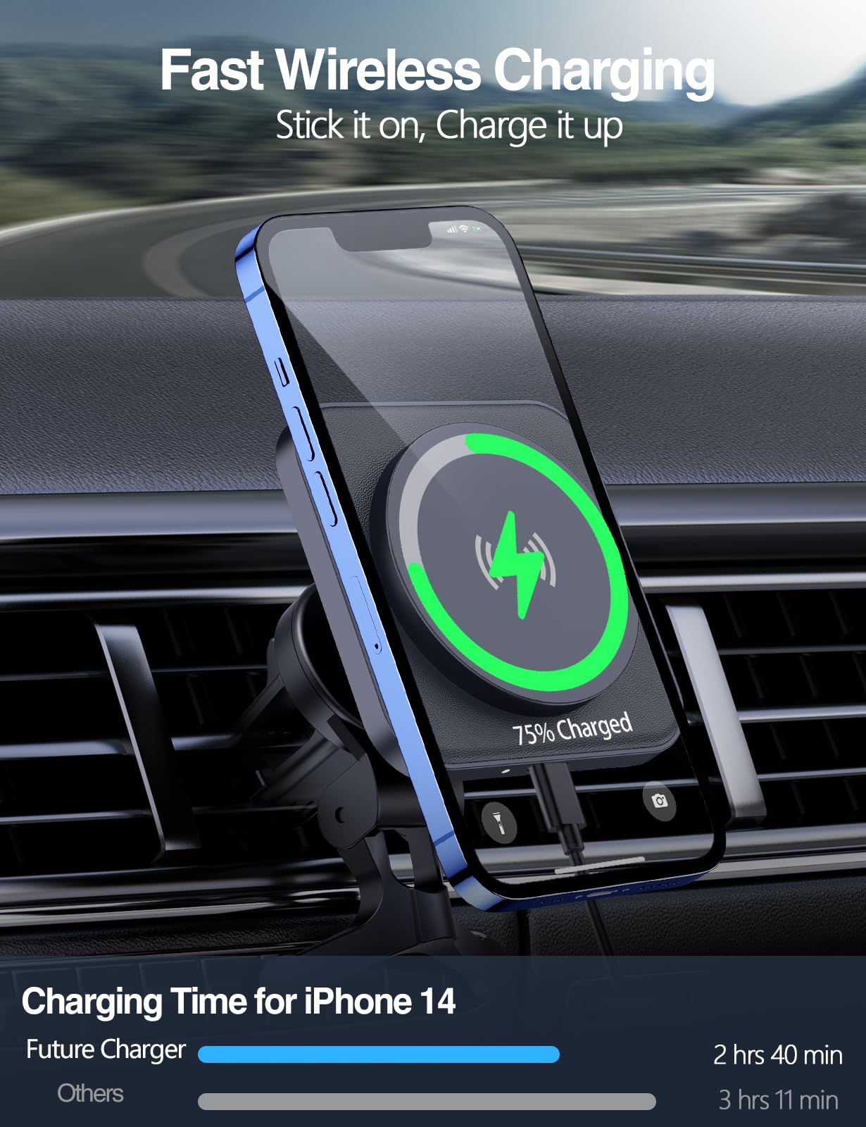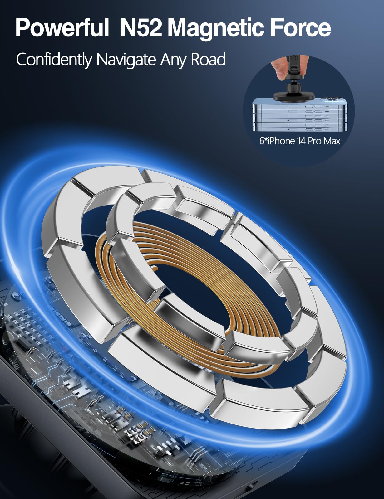 - Super Strong Magnetic Force: The magnetic wireless car charger mount is built-in 18x N52 strong magnets with 1400g suction force, holding your phone tightly even on bumpy roads; Snap and charge