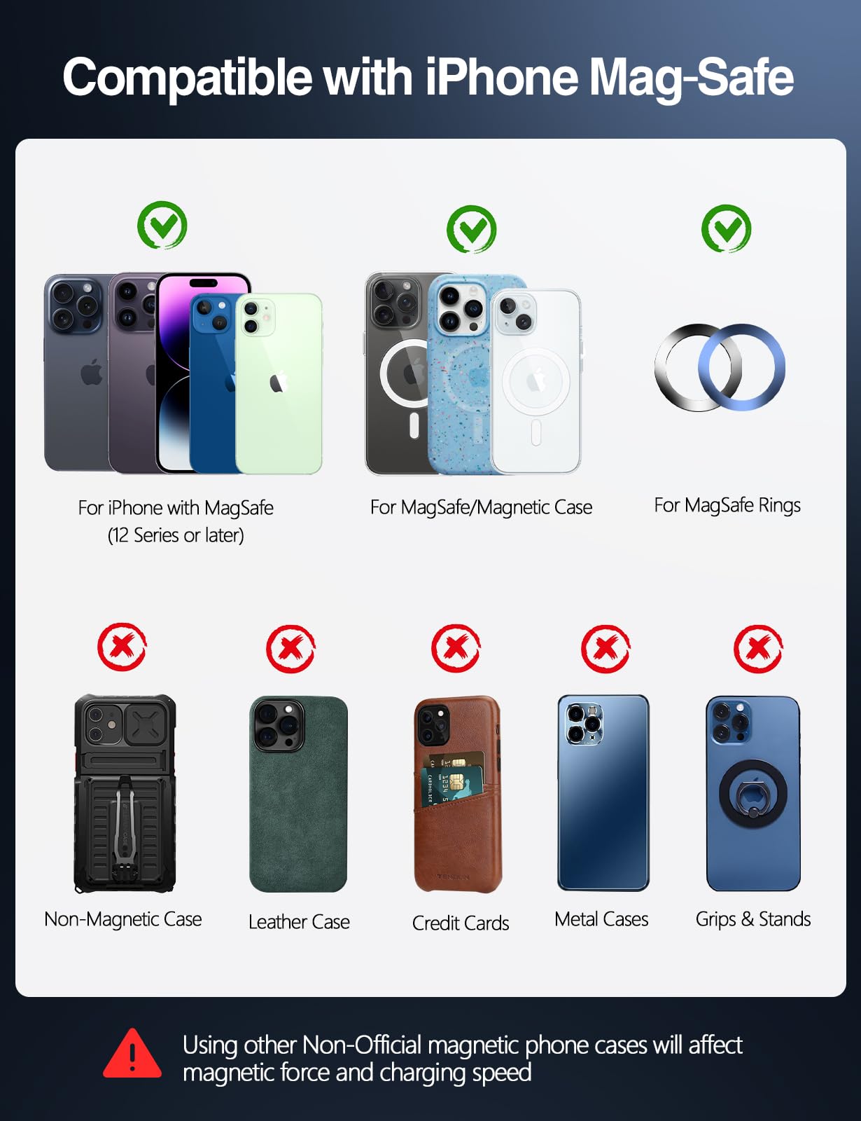 - Made for MagSafe: Compatible with iPhone 16/15/14/13/12 series caseless or with magnetic cases; Incompatible with the non-magnetic cases, even thin cases; For iPhone 8-11 series, Galaxy, Pixel, and LG, the phones must come with magnetic cases