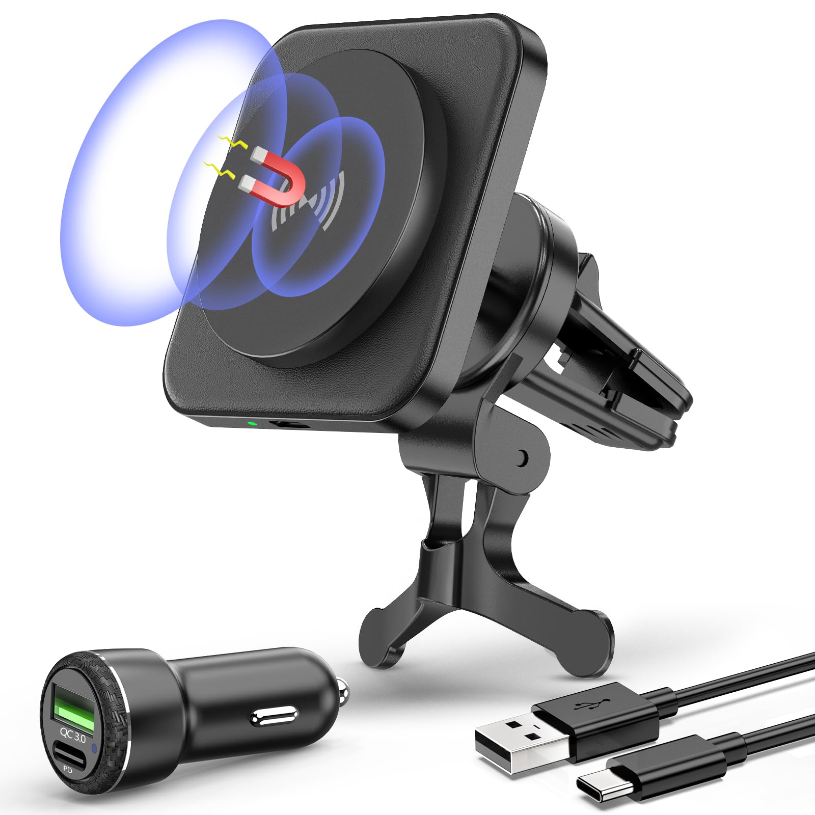 for MagSafe Car Mount Charger - 15W Wireless Magnetic Car Charger Holder for iPhone 16/15/14/13/12 Series, Air Vent, Stable, Strong Magnets, Vegan Leather, Black with Adapter