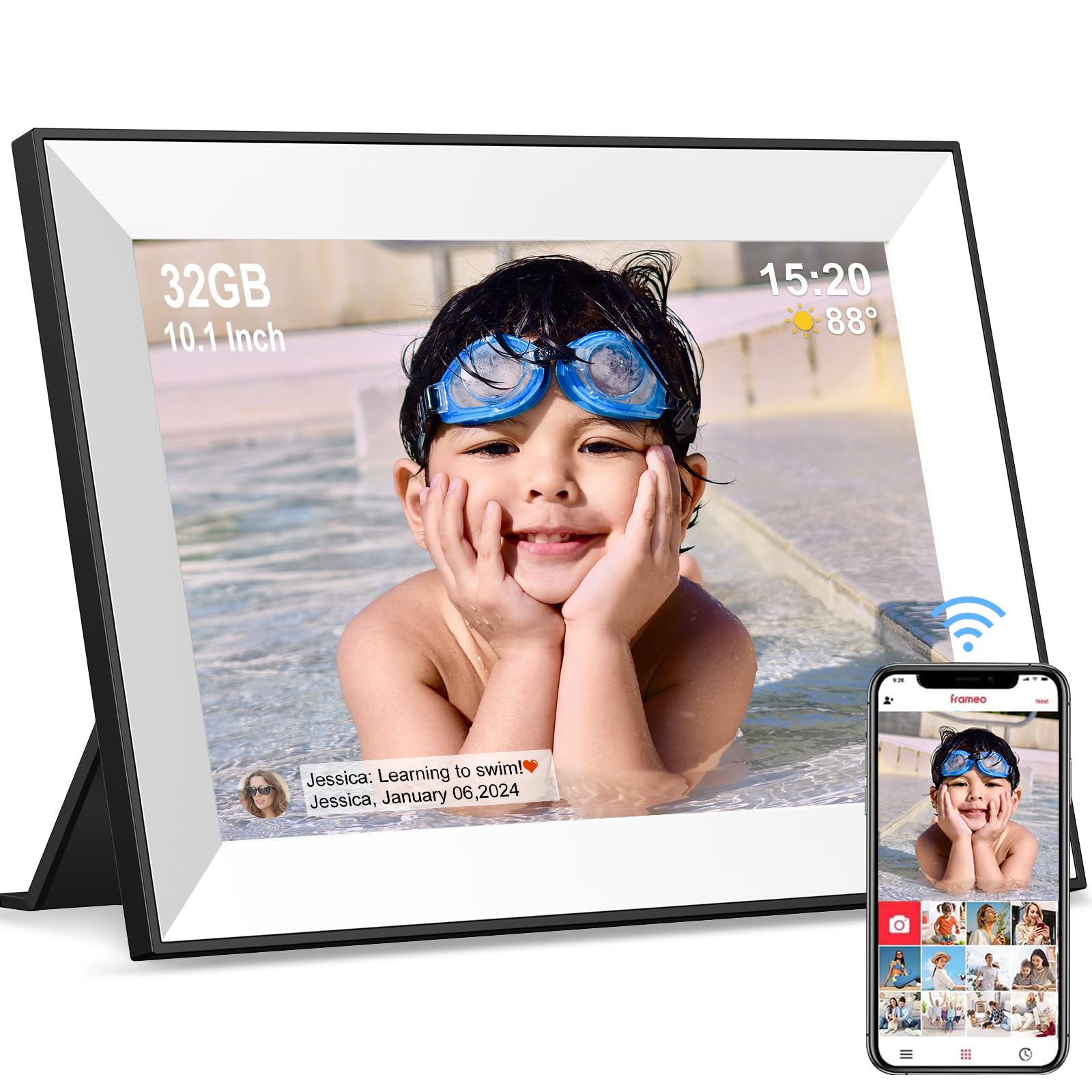 Frameo Digital Picture Frame,WiFi Slideshow Digital Photo Frame with 10.1 Inch IPS Touch Screen,Load from Phone to 32GB Digital Frame,Smart Rotating Pictures via White Electronic Picture Frame,Gift