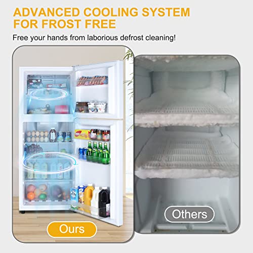 - Frost Free for Effortless Clean: Our refrigerator circulates cold air throughout the freezer and refrigerator zone so that you'll never defrost your freezer. Just wipe the food residue out with the cleaning rag. Also, it is equipped with the removable door seal for effortless cleaning.