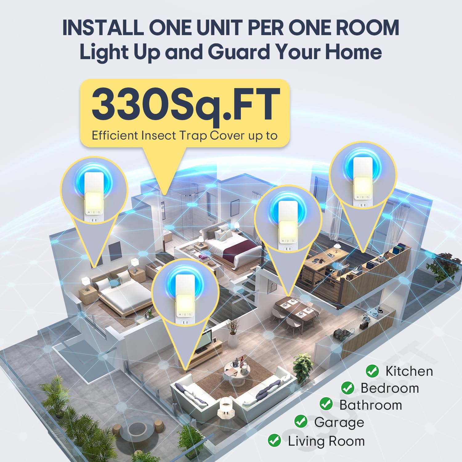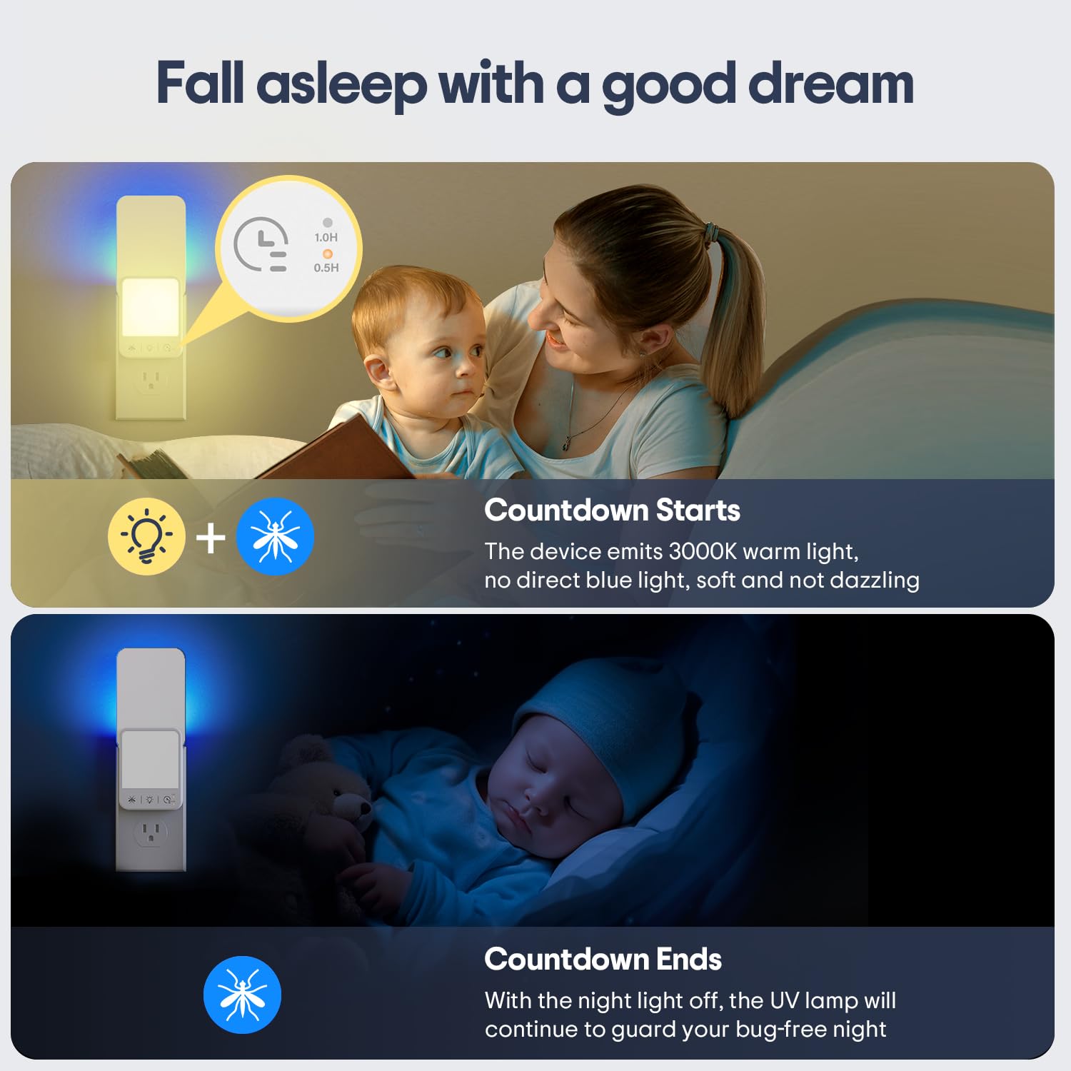 - 【LDE Night Light & Timer Function】This plug in bug catcher indoor has two warm light mode, not only it can be used as lighting, but also can be used as a night light to aid your sleep. Mosquito trap can be set a timer setting of 0.5 or 1 hour before sleeping. Or you can choose the regular lighting mode. Multiple mode choices can help you go to full sleep faster.