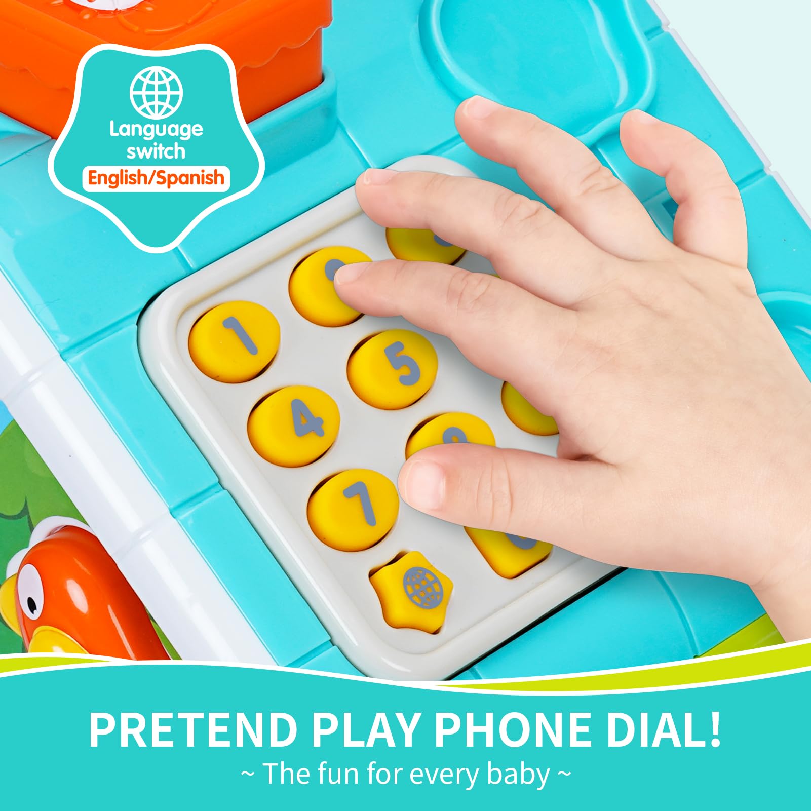 - Interactive Baby Learning Toy: With over 6 interactive features, including piano keys with 3 modes, a baby phone toy with dual-language (in English and Spanish) and sound effects. This toy also includes a mirror and 4 different shapes for recognition, enhancing fine motor skills. Making it one of the best baby learning toys for 6-12 months.