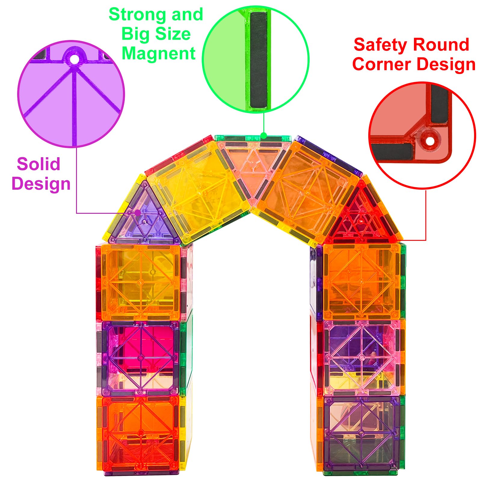- 【Safe and Durability】Safety is and always will be our top priority. Our Magnetic tiles are made of Non-Toxic and durable ABS plastic. A smooth surface round edge design won't scratch or hurt little hands. The magnetic blocks are sealed to keep the tiles from breaking or swallowing. Ultrasonic welding technology, better tightness, magnet is not easy to fall off, let your kids release their endless creativity and free their imagination.