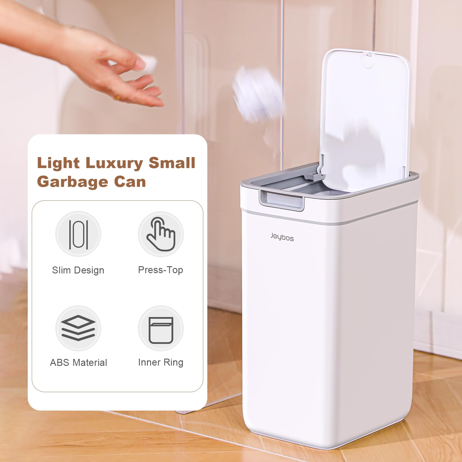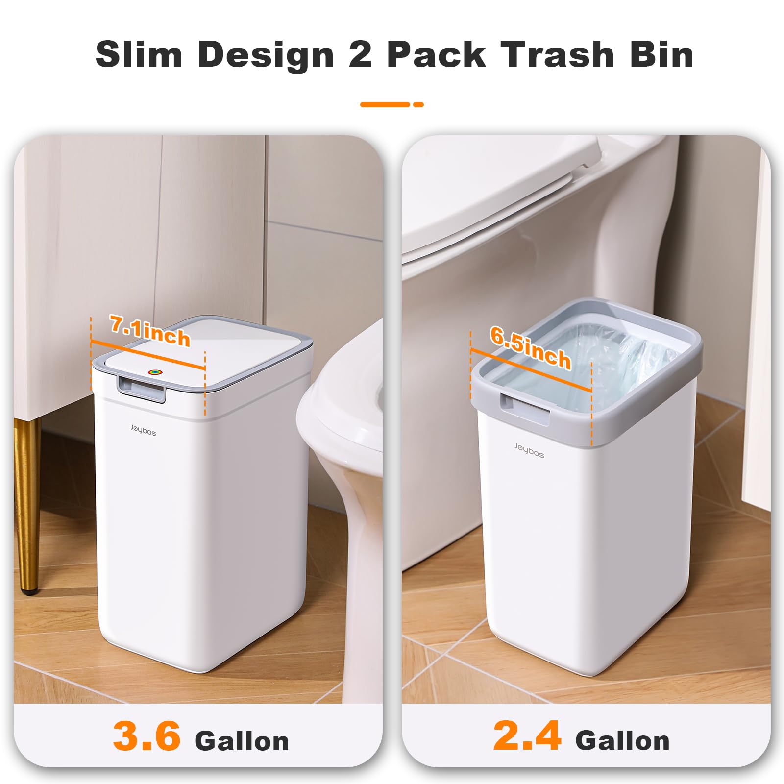 funest Bathroom Trash Can, 2 Pack Small Trash Can, S02 Plastic Waste Basket for Bedroom, Narrow Trash Bin for Home and Office, 3.6 Gal (Press top lid) + 2.4 Gal (Open lid)