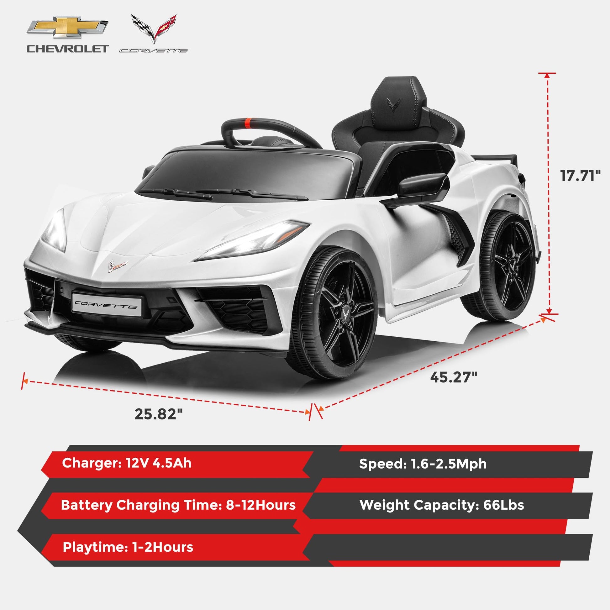 - Chevrolet Corvette C8 Brand License: The kids car offers a realistic driving experience with features like the start button of an electric vehicle, engine sounds, a shiny dashboard, and LED lights.