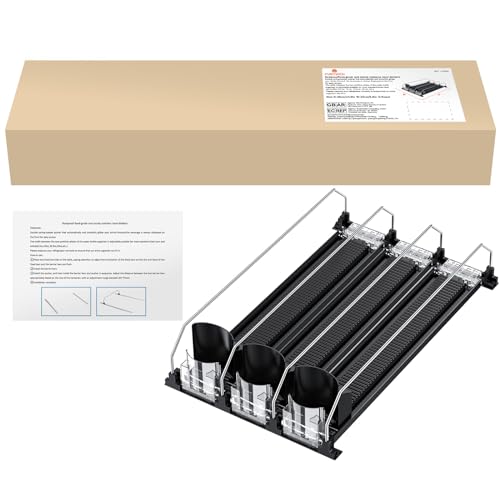 Details: 3 row automatic can dispenser for fridge---automatic pusher glide designed with arc-shape and spring, fits can and bottle perfectly, not easy to squeeze deformation. Push-spring and bottom roller design make beverage slide forward automatically and smoothly, keeps your drinks tidy and within reach.