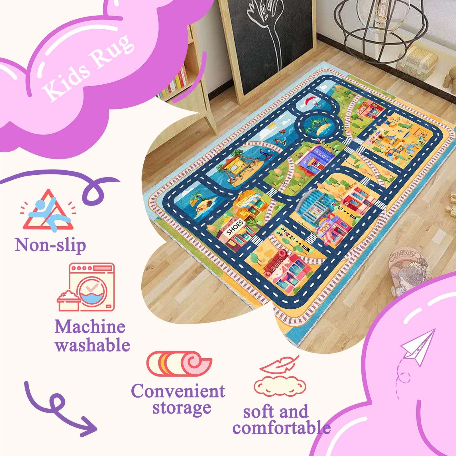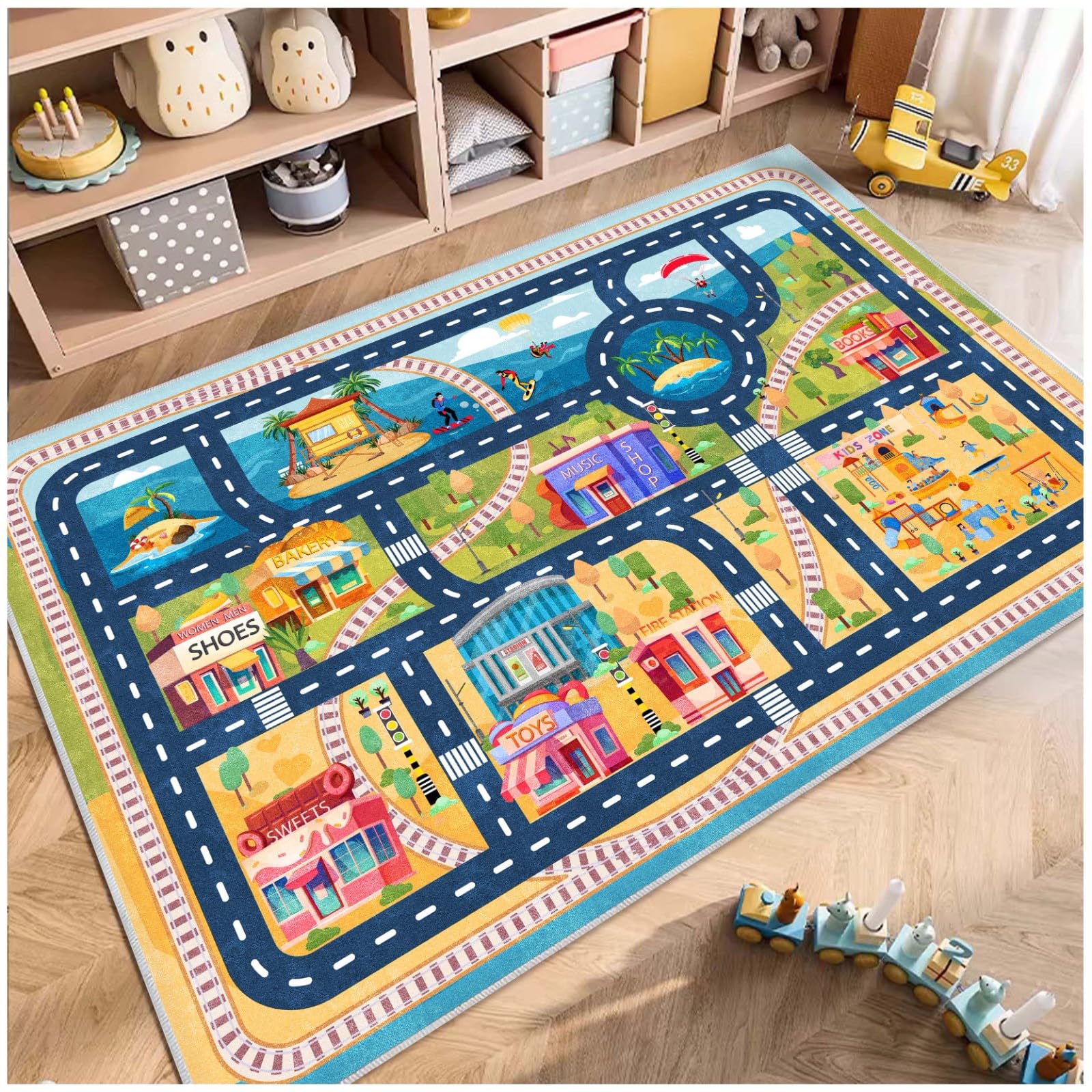 - 【Kids City Theme Game Carpet】This children's city themed game carpet showcases vivid and interesting racing scenes, with bright colors and rich design details. Let children enjoy the fun of exploration while playing. This carpet is not only a playground, but also an interactive learning space, allowing children to enjoy the fun of learning and growth while playing.
