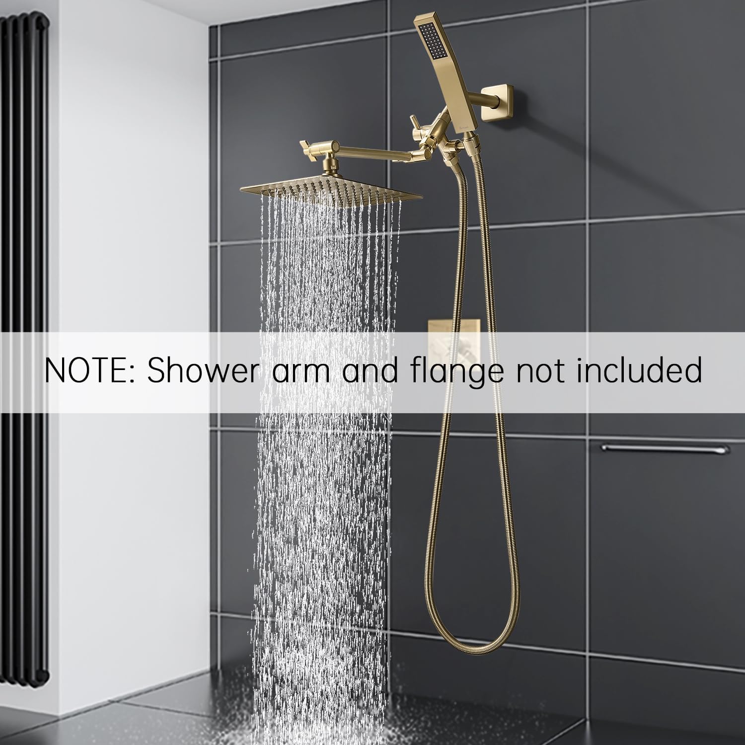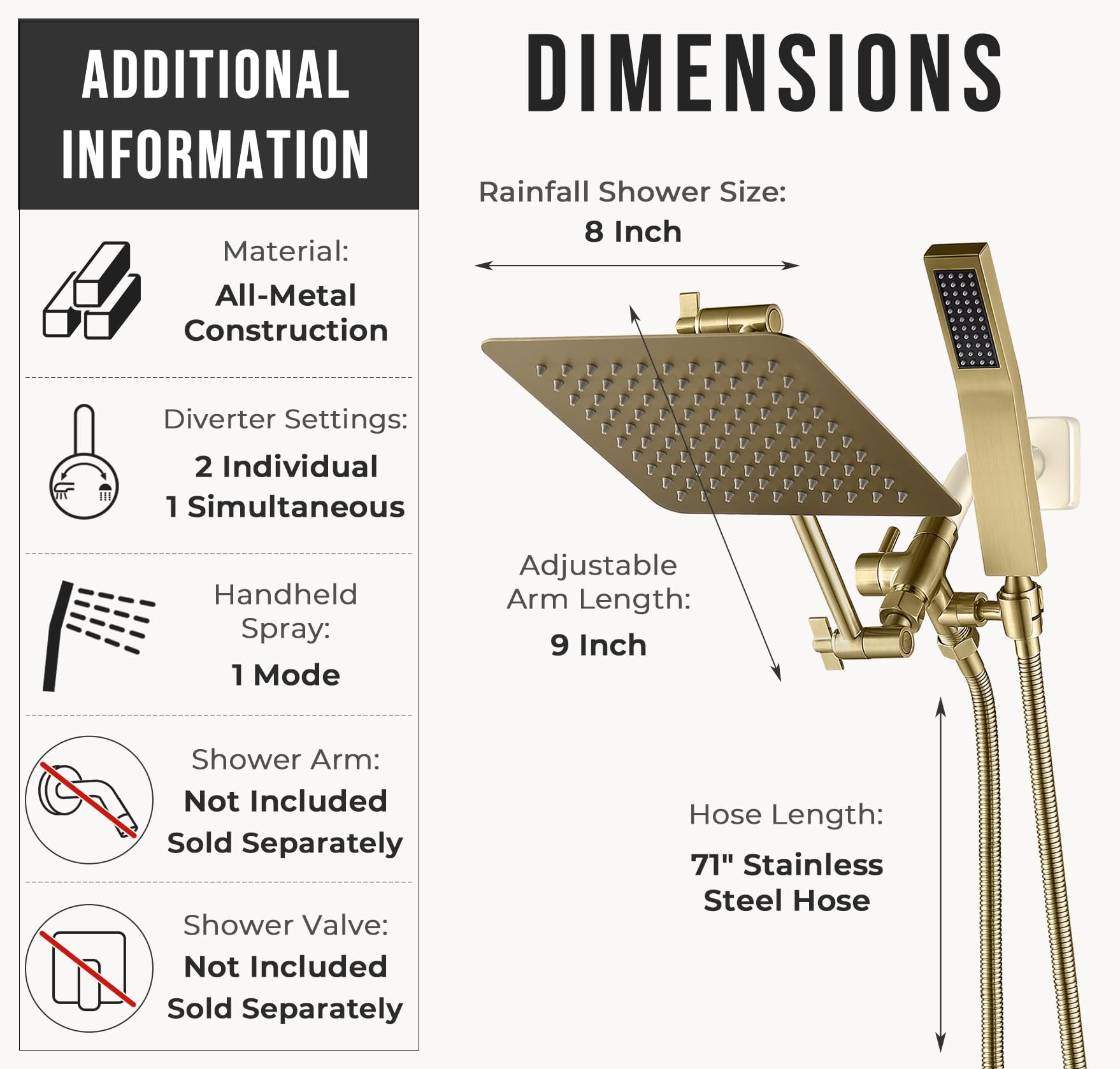 G-Promise All Metal 8-Inch Dual Square Shower Head Combo, Rain Shower Head, Handheld Shower Wand with 71-Inch Extra Long Hose, 3-Way Diverter, Adjustable Extension Arm, Brushed Gold