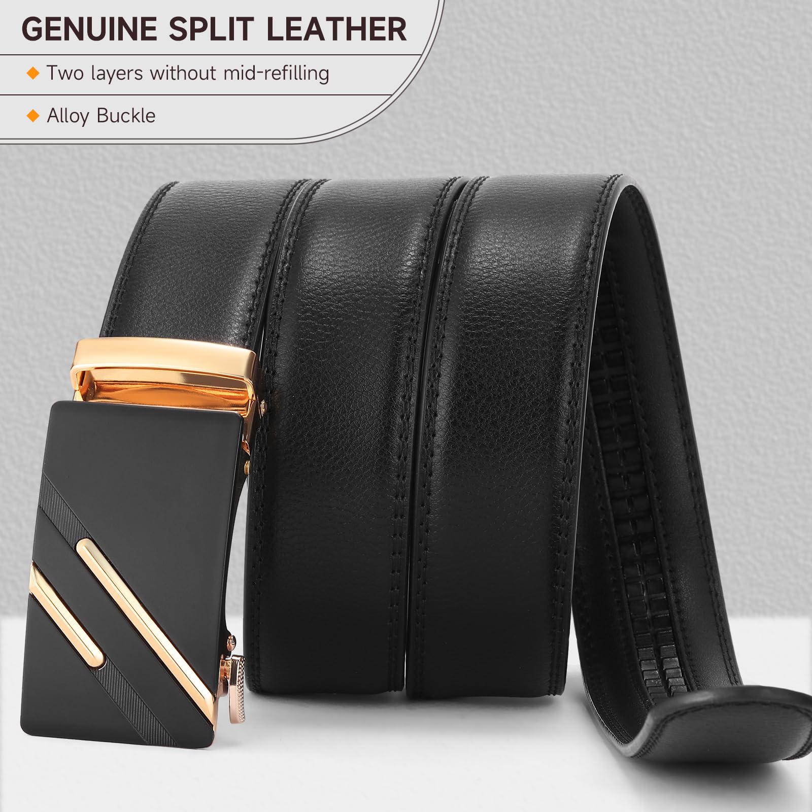 - Exact Fit Holeless Belts: The Ratchet belt allows for up to 1/5" adjustments for perfect fit everywhere. No trouble with size in-between holes! In the back of the belt, there are 32 ratchet notches, and it provides a micro size adjustment of 0.25", which can follow the variation of your waist precisely. The ratchet belt features an easily removable buckle that allows you to cut the leather belt to your ideal size.