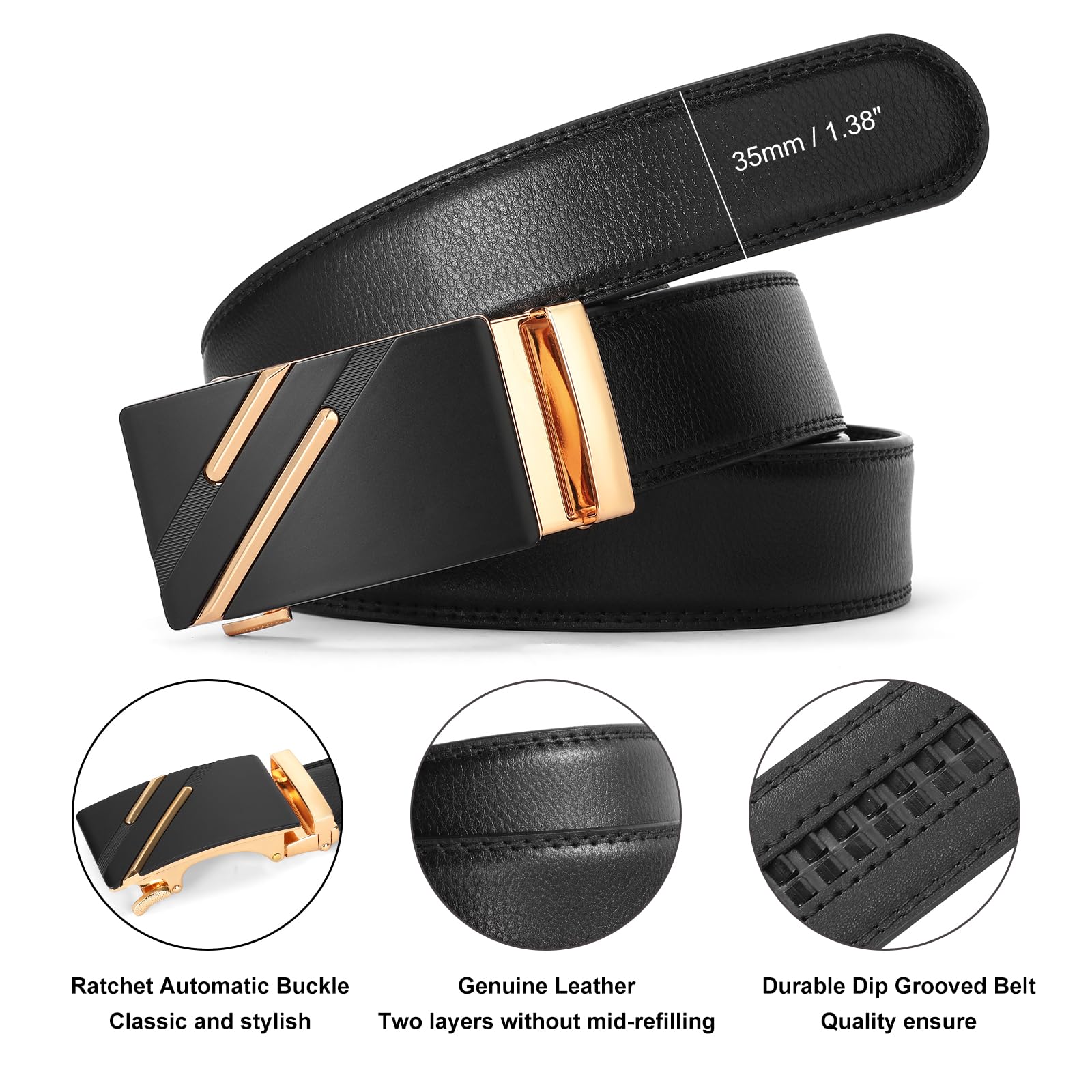 GAEKEAO Men's Ratchet Belt Genuine Leather 1 3/8" Slide Belt for Men Automatic Adjustable Click Buckle Belts for Dress Casual Trim to Fit