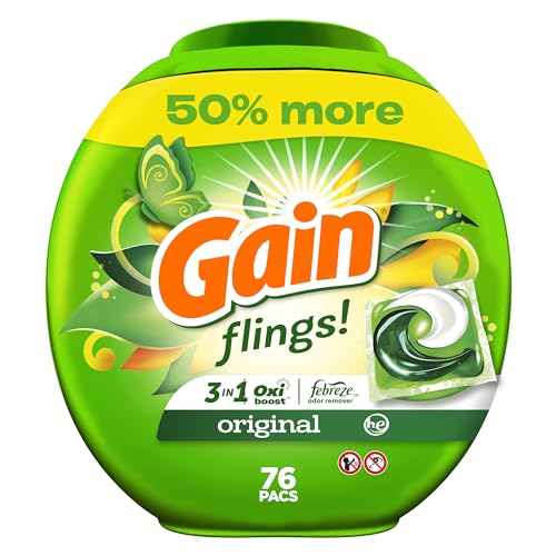 Gain flings! laundry detergent pacs are packed with 50% more scent than Gain liquid laundry detergent. Armed with the stain-fighting power of Oxi and Febreze, they give you nothing but great, clean, amazing-smelling laundry. Use with any laundry set-up, because Gain flings! Pacs dissolve in both hot and cold water and are HE compatible. Gain's refreshing Original Scent infuses your clothes with the fragrance of the green, clean, airy outdoors, so you're always just one quick sniff away from the most invigorating scent experience known to humankind.