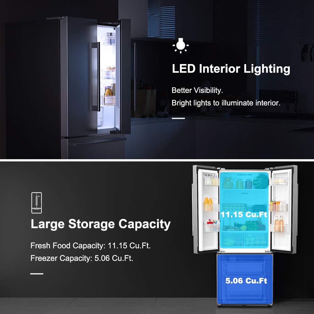 Galanz GLR16FS2K16 3 French Door Refrigerator with Bottom Freezer & Installed Ice Maker, 16 cu ft, Stainless Steel