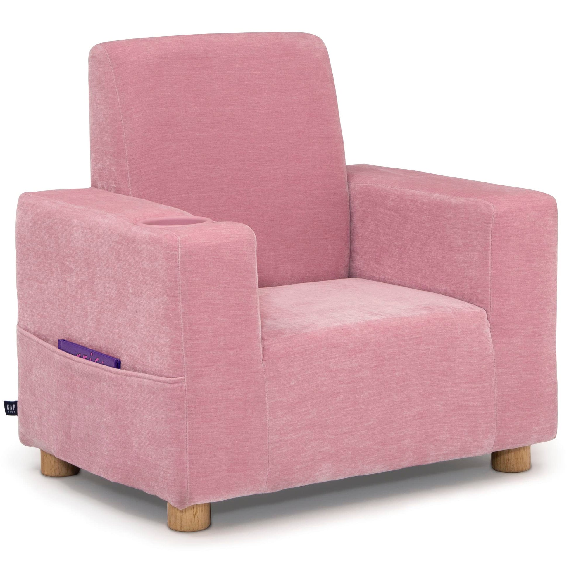 Details: Ultra-cozy and just the right size for little ones, this GapKids by Delta Children Upholstered Chair is the perfect addition to any playroom or bedroom. Upholstered in a super-soft velour fabric, it’s a comfy spot for reading, relaxing or snuggling. Incredibly versatile, this chair features a built-in cup holder and storage pockets on both sides for additional storage. Complete your child’s space by mixing, matching, and layering this kids’ chair with other pieces from the GapKids by Delta Children Collection.