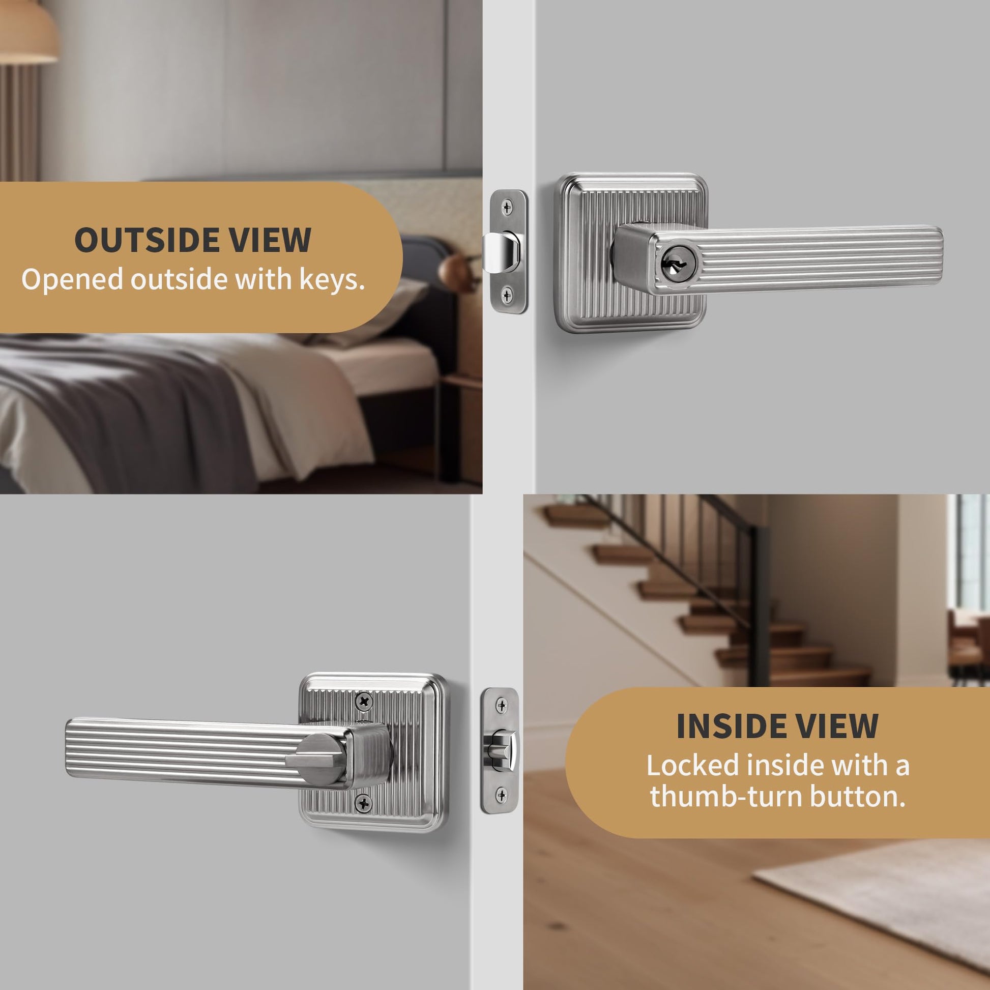 - {KEYED ENTRY FUNCTION} Square locking lever handle with keys is ideal for various spaces, such as exterior doors and front doors, providing enhanced security where needed. Operable with a key from the exterior and a turn button from the interior.