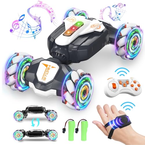 - 【2.4GHz Technology】: The RC stunt car adopts 2.4GHz technology, which can support multiple people to use it at the same time and is not easy to be interfered, so your child can race and compete with friends and enjoy more interactive fun. We have equipped this RC cart with 2 control modes. ① gravity sensing watch remote control ② traditional handle remote control, both remote control modes can make your driving experience more convenient and comfortable.