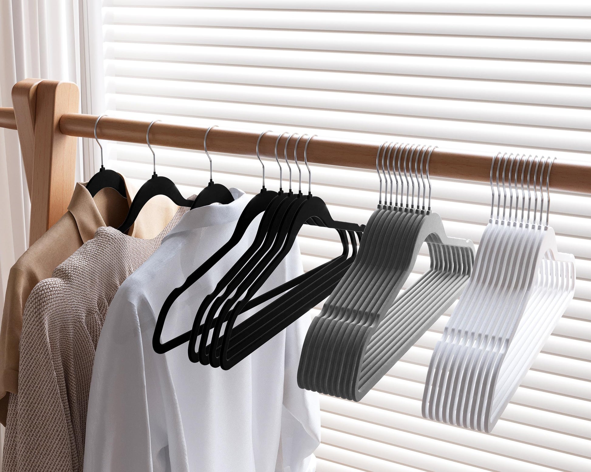 - [ Dorm Room Essentials ] These plastic hangers feature a premium velvet-covered surface, which feels smoother and neater compared to other regular velvet hangers.And the velvet coating is less likely to shed, allowing you to confidently hang your clothes in your dorm room. With grooved sides designed to prevent slipping, you can hang your clothes on this hanger without worrying about them falling off, as it does its job well of hanging your clothes.
