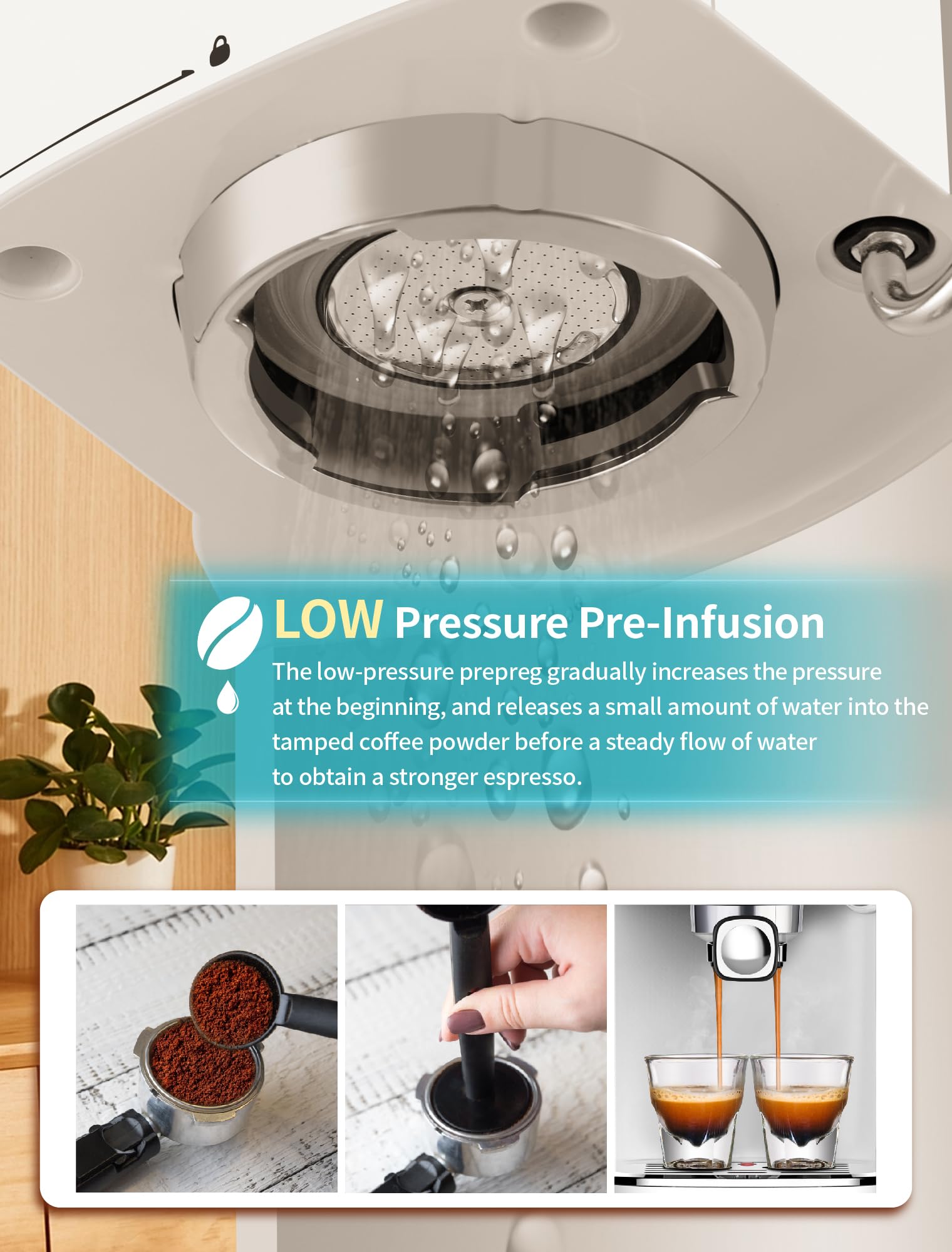 - 【20 BAR FOR BEST FLAVORS】: Espresso Machine, 20 bar professional Italian pump, with 1100W powerful pressure to extract coffee. NOTE: Turn off by yourself when reaching the desired amount of espresso.