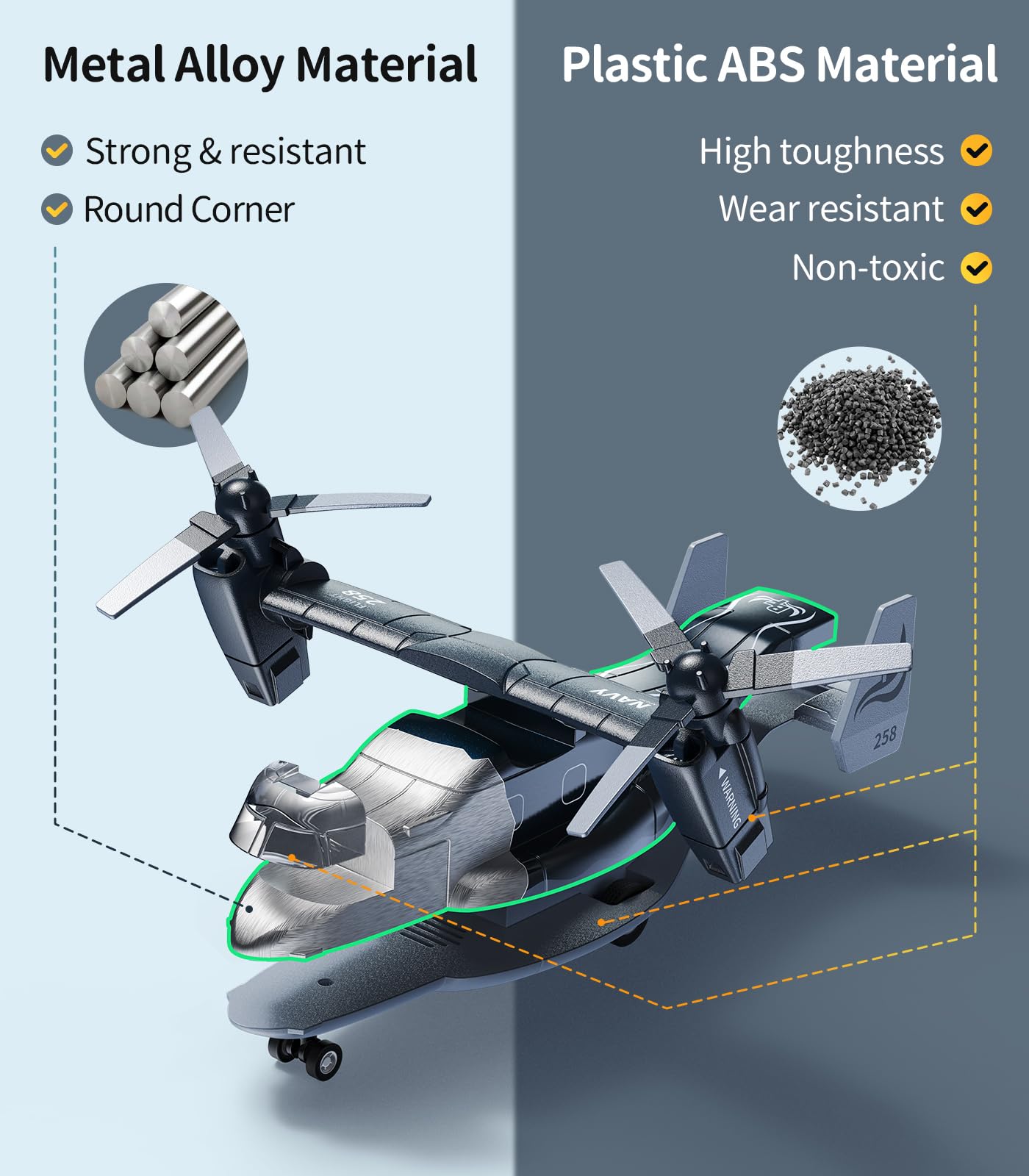 - 【Durable and Child-Safe】The three small airplanes are made with all-alloy exteriors and ABS plastic bottoms. The larger helicopter combines an alloy body with ABS plastic wings, offering strong resistance to impacts and drops. These toys are certified by CPC, ASTM, CPSC, and other US standards, providing moms with reassurance for safe playtime.