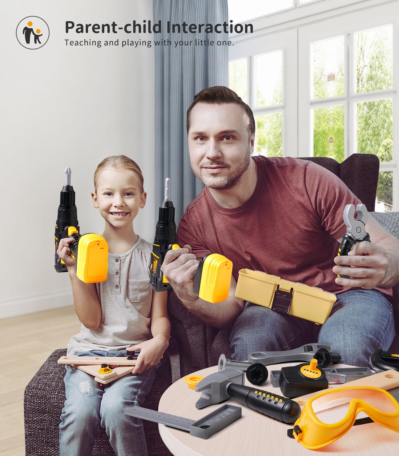 Geyiie Toy Tool Set with Power Drill, Pretend Play Kids Tool Set, Goggles, Preschool STEM Toys Outdoor Tool Kit Party Birthday Gift for Toddler Boys Girls Age 3 4 5 6 7 8