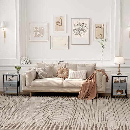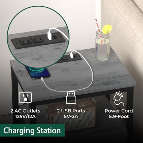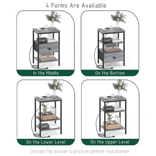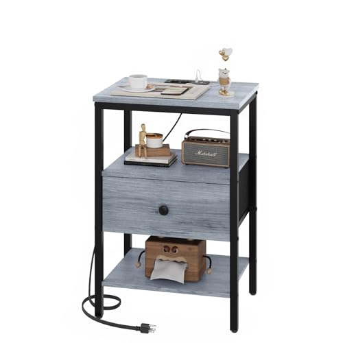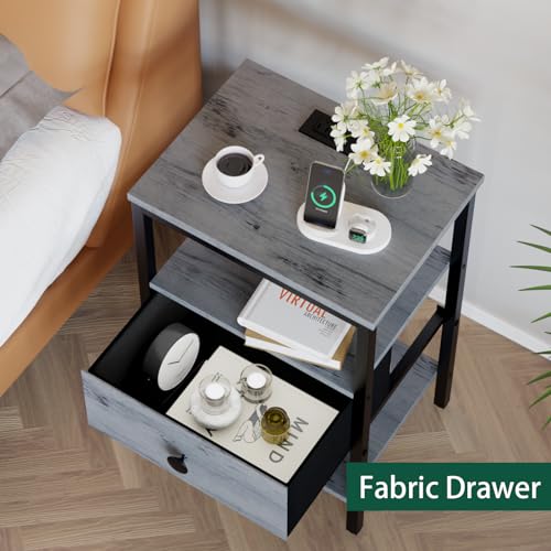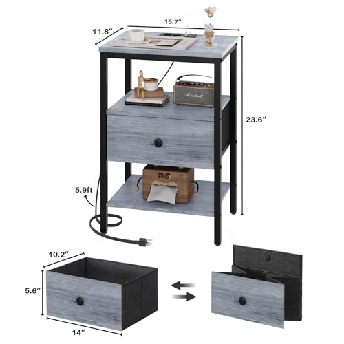 GGWEW Night Stand with Charging Station, Nightstand with Adjustable Drawer & Shelf, Small Nightstands for Bedroom, Fabric Drawer with MDF Front, 5.9ft Power Cord - Light Grey Blue