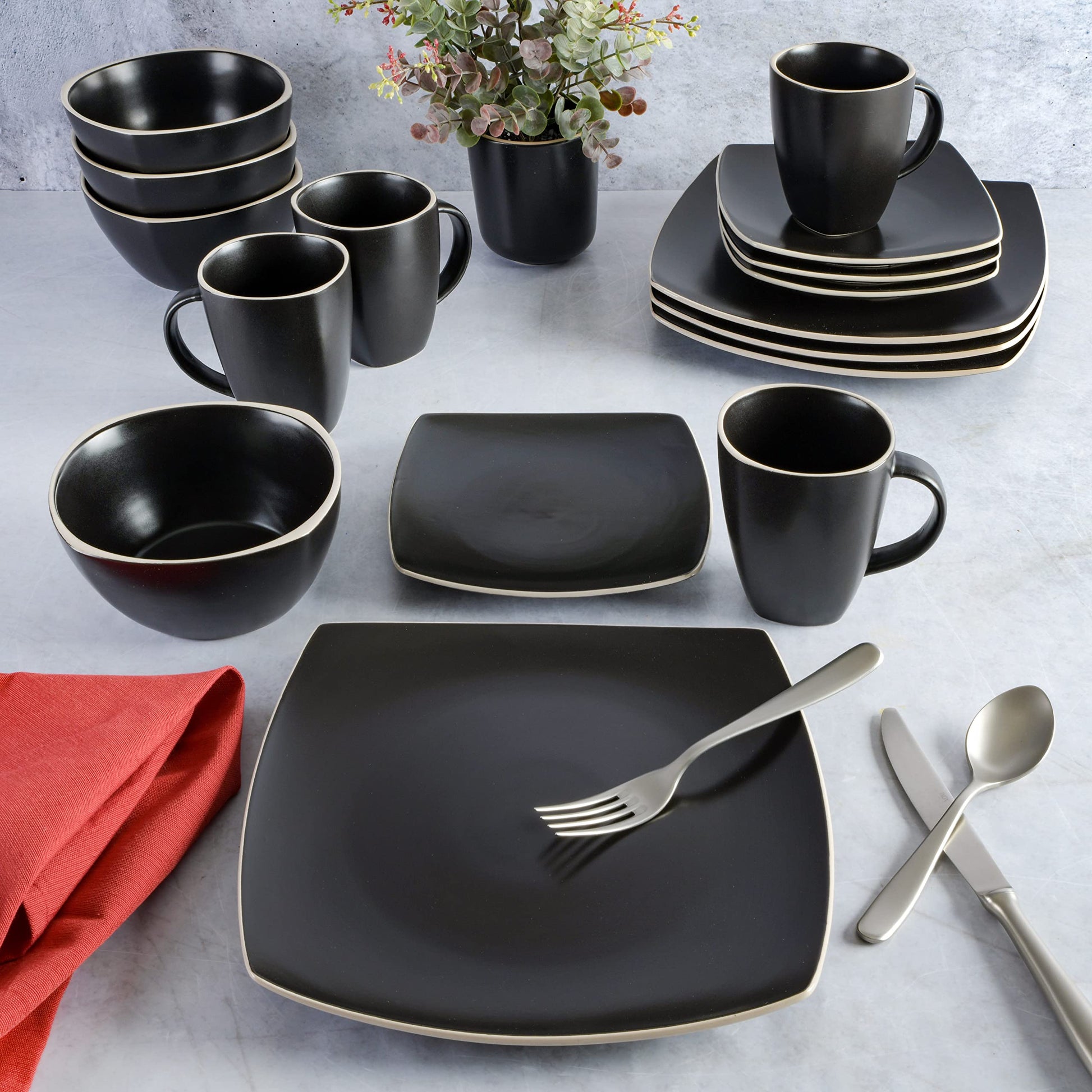 Add a stylish, contemporary plates and bowls to your table with the Gibson Soho Lounge Square 16-piece dinnerware set. If you are looking to bring a modern feel dishes to your home, this set is an excellent choice. A contemporary square stoneware shape and a stunning color design elevate any occasion and create a beautiful platform to show off your delicious meals with this plates and bowls sets. The Gibson Soho Lounge dinner set collection is available in many colors making it easy to find the right set to go with any table setting and in any kitchen. The Gibson Soho Lounge Square 16-piece dinnerware set comes with complete service for four including a dinner plates, dessert plates, bowls, and mugs, providing you with all the dishes you need for a casual dinner at home or entertaining friends. This is a great dish set for 4, 8, 12, or more as the traditional composition allows for endless possibilities. All these Soho Lounge dishes are made of durable stoneware that is both dishwasher and microwave safe. Bring the style and value of Gibson to your home today with this Soho Lounge plate set.