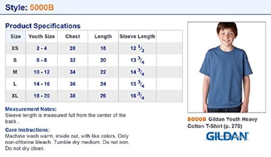 Details: Gildan’s Youth Heavy Cotton T-Shirt is a great wardrobe addition that can be worn year-round to school, games or the playground. It’s made of sturdy, midweight 100% U.S. cotton and features a classic fit. Add colorful, fun graphics using screen printing, embroidery, iron-on transfers or give it a retro feel with bleach or tie dye. Companion styles for men, women and toddlers make it family friendly!