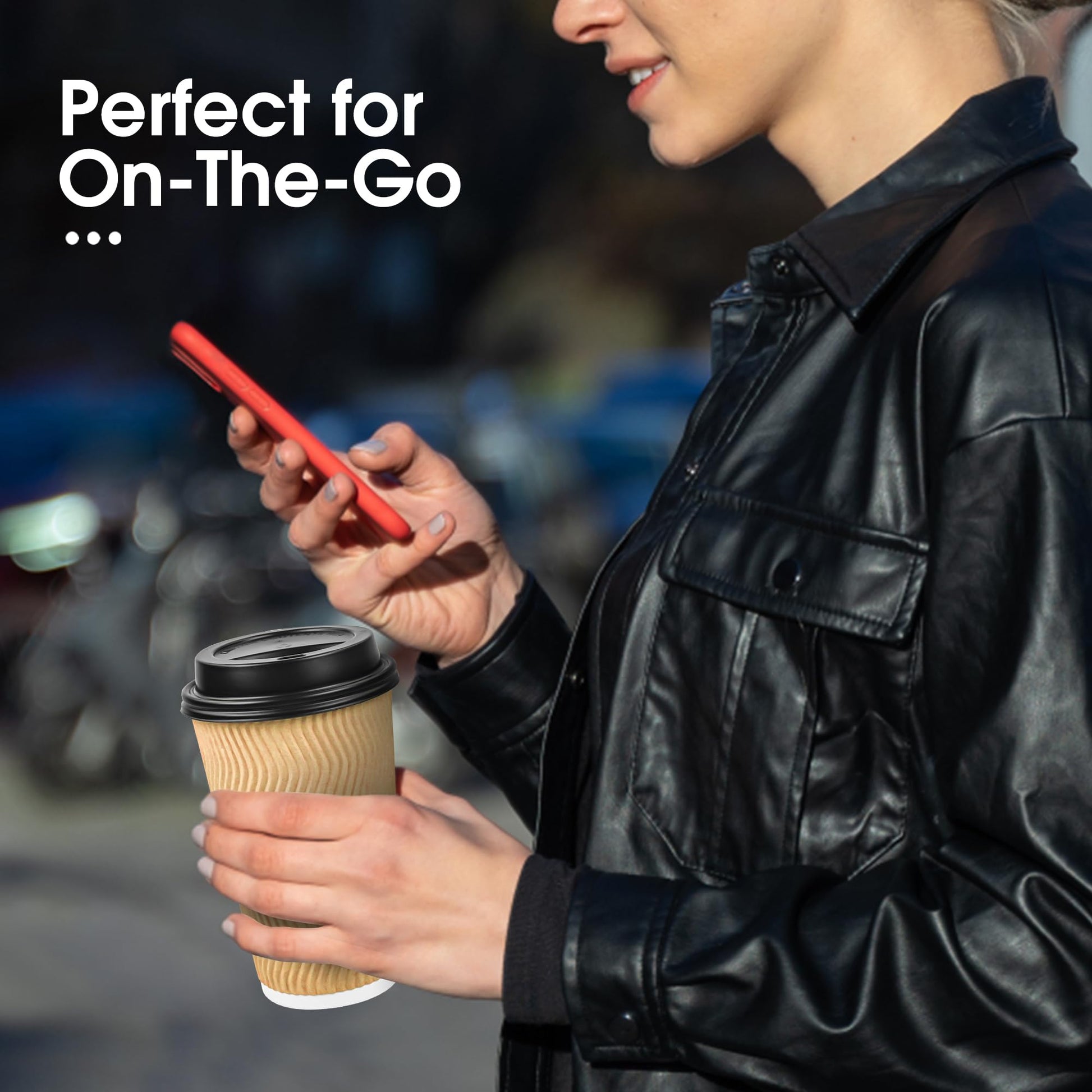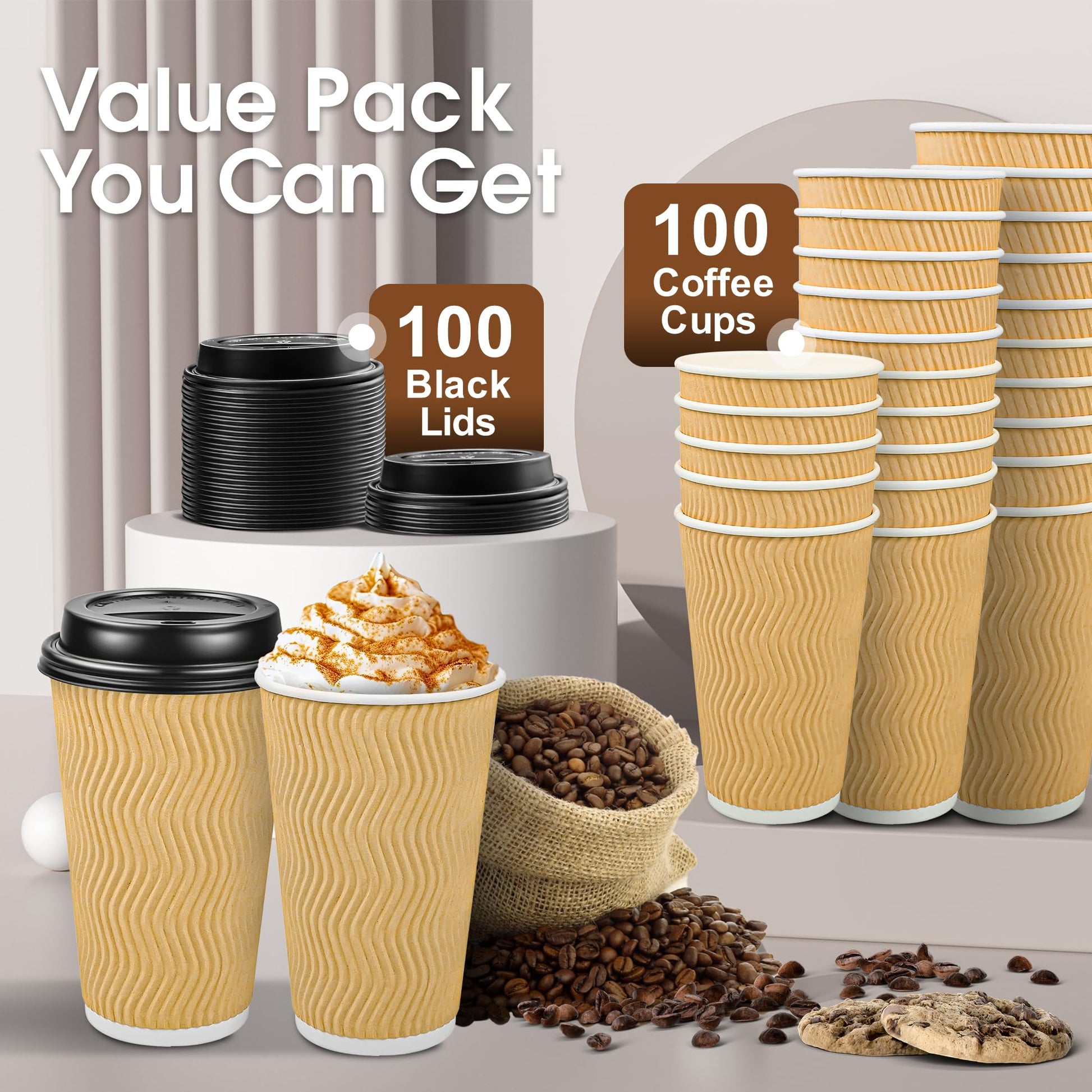 Ginkgo 100 Pack Disposable Coffee Cups with Lids 16 oz, Insulated Ripple Wall To Go Paper Cups for Party Home and Travel - Beige