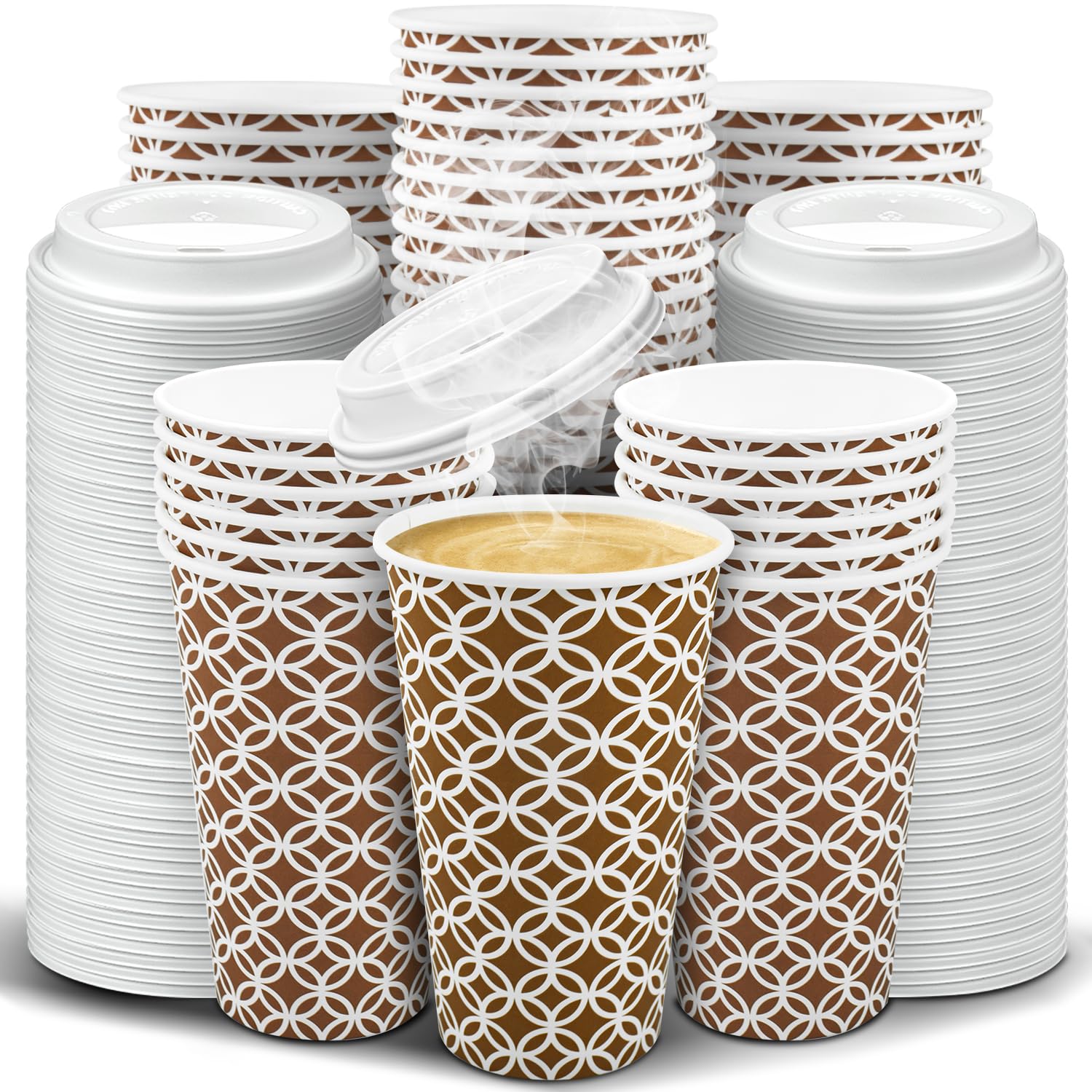 Ginkgo 100 Pack Disposable To Go Coffee Cups with Lids 16 oz, Brown Minimalist Pattern Paper Hot CoCoa Cups Suitable for Travel, Party, Shops Cafes