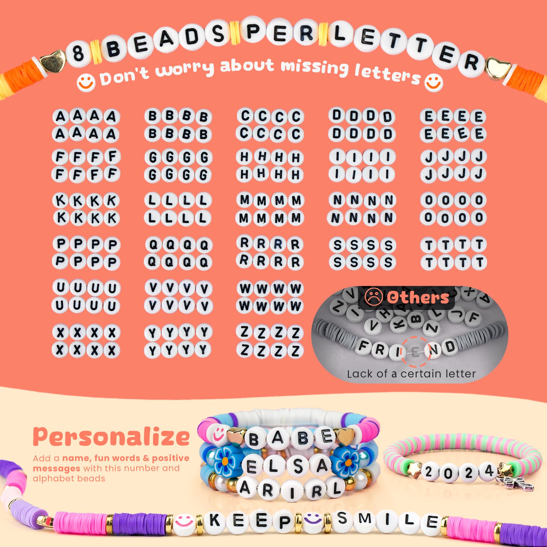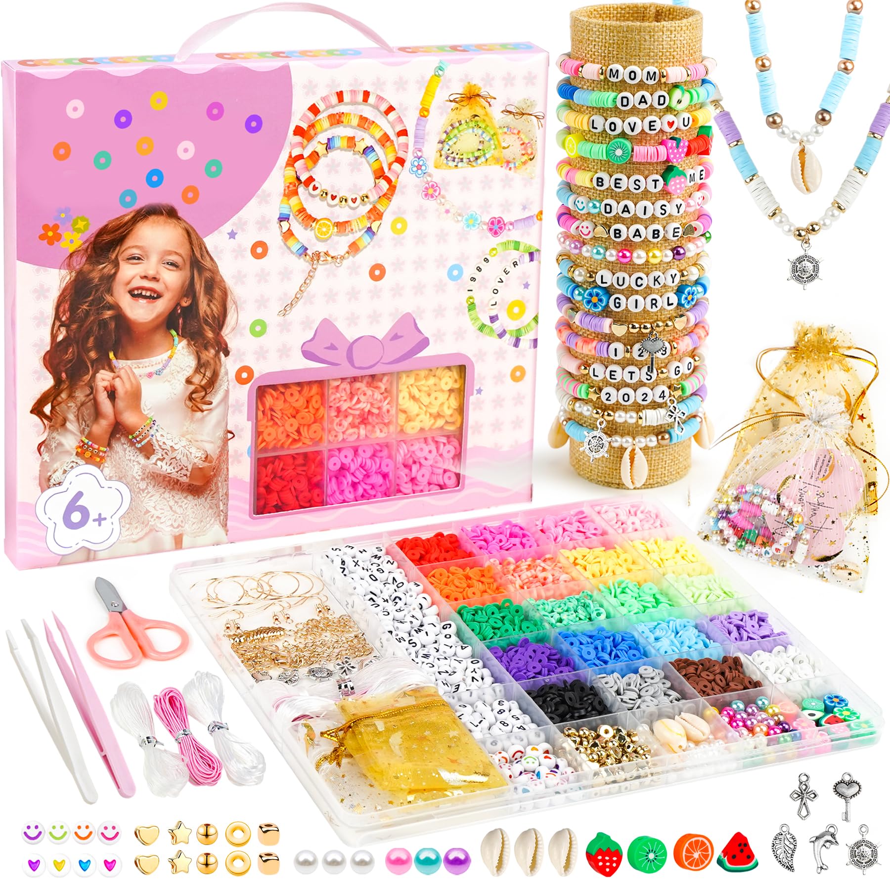 - Funny Crafts Kit for Girls: The packaging includes: 3600pcs 20 colors clay beads, 208pcs letter beads (26 letters from a to z, each with 8 beads), 500pcs decorative beads, including shells, pearls, silver pendants, number beads, smiling hearts, flowers, fruit beads, etc. There are also 2 organza gift bag, 3 bundles of elastic ropes, scissors, tweezers, all tools are complete and very beginner friendly