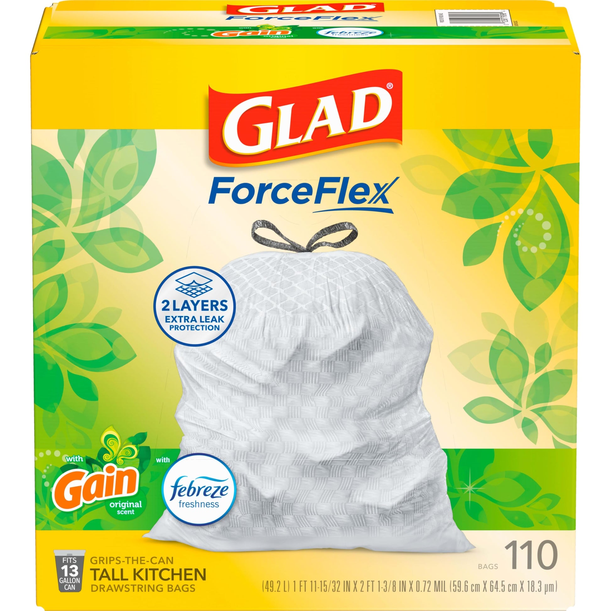 Glad ForceFlex Tall Kitchen Trash Bags, 13 Gal, Gain Original with Febreze, 110 Ct (Pack May Vary)