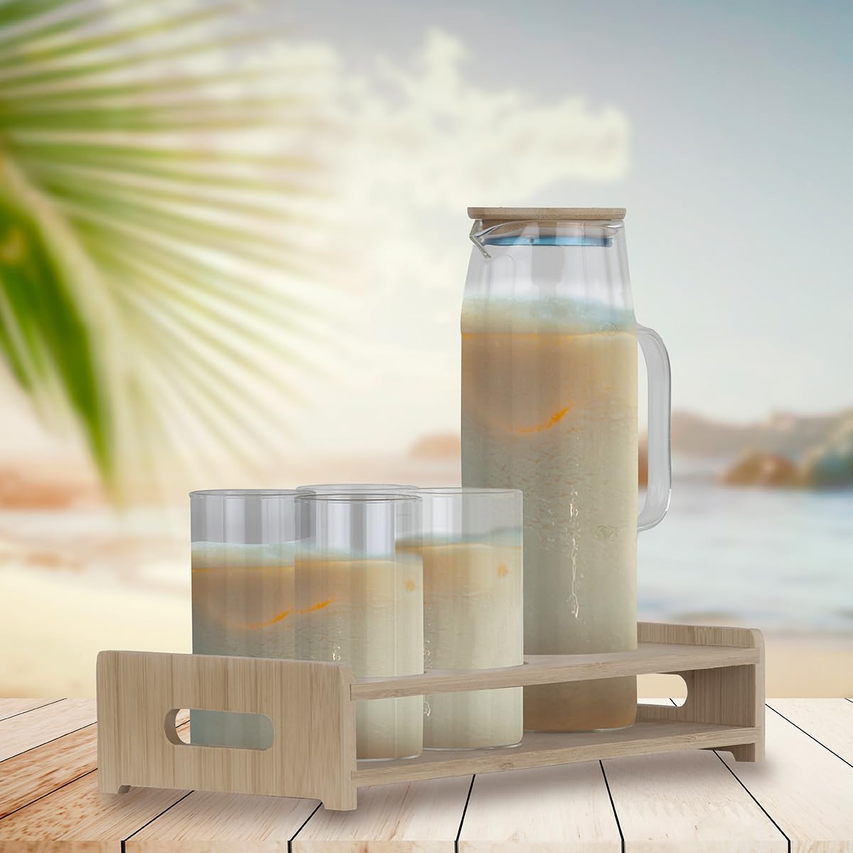 - Complete Set for Entertaining: This set includes a 50.7 oz pitcher and four 11.8 oz glasses, all perfectly sized for any gathering. The bamboo base adds a stylish and stable platform, making it an ideal centerpiece for your table while offering convenience and practicality.