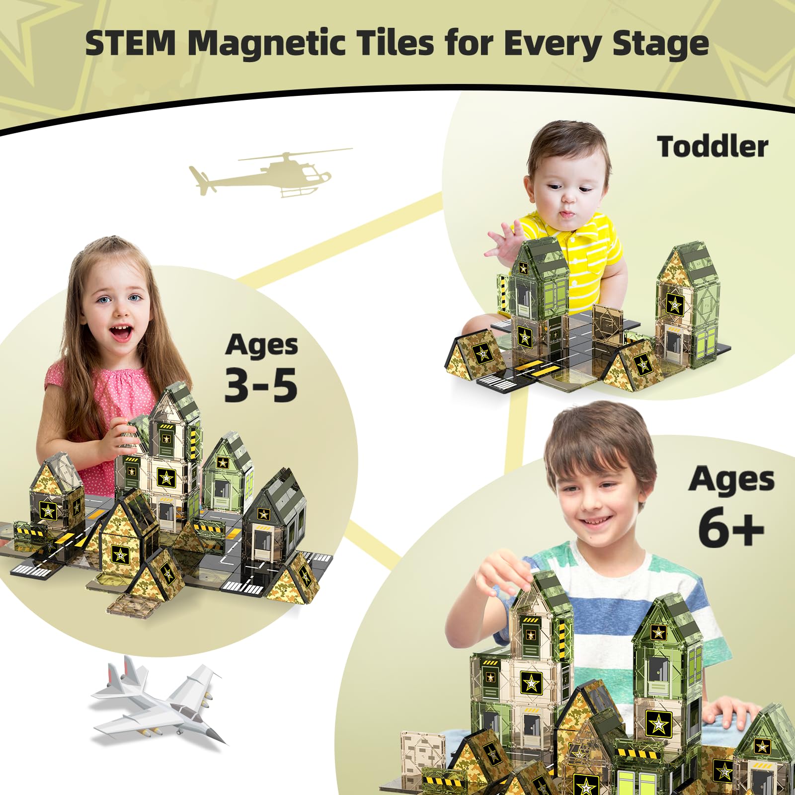 - 100PCS Army Themed Magnetic Tiles: GobiDex military toys magnetic tiles road set is well-suited for children interested in army men playset, Includes 100 army magnet tiles to build army base, from simple barracks to commands center, enhancing coordination