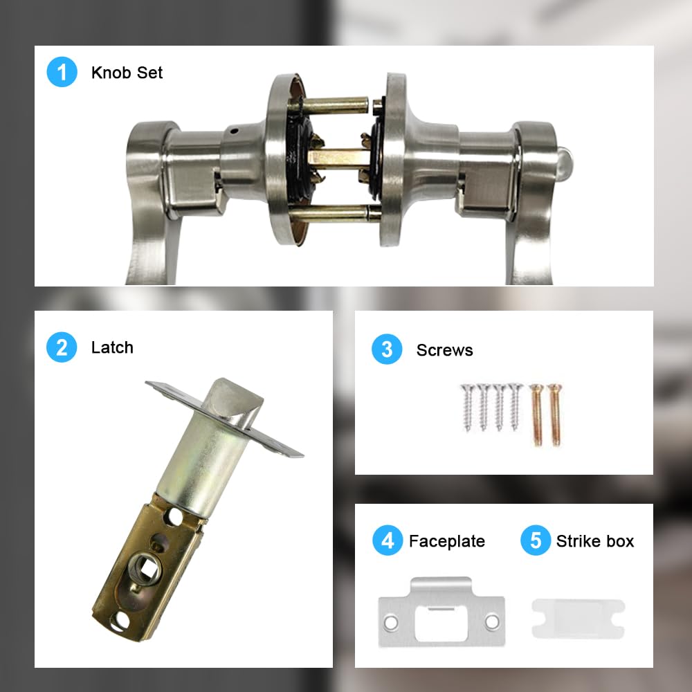 - Package: 10 x Levers for both sides of the door, 10 x Latch mechanism,10 x Strike plates, 40 x Mounting screws, 40 x Short screws, 20 x Long screws, Installation Instructions. All Hardwares and instructions are included.