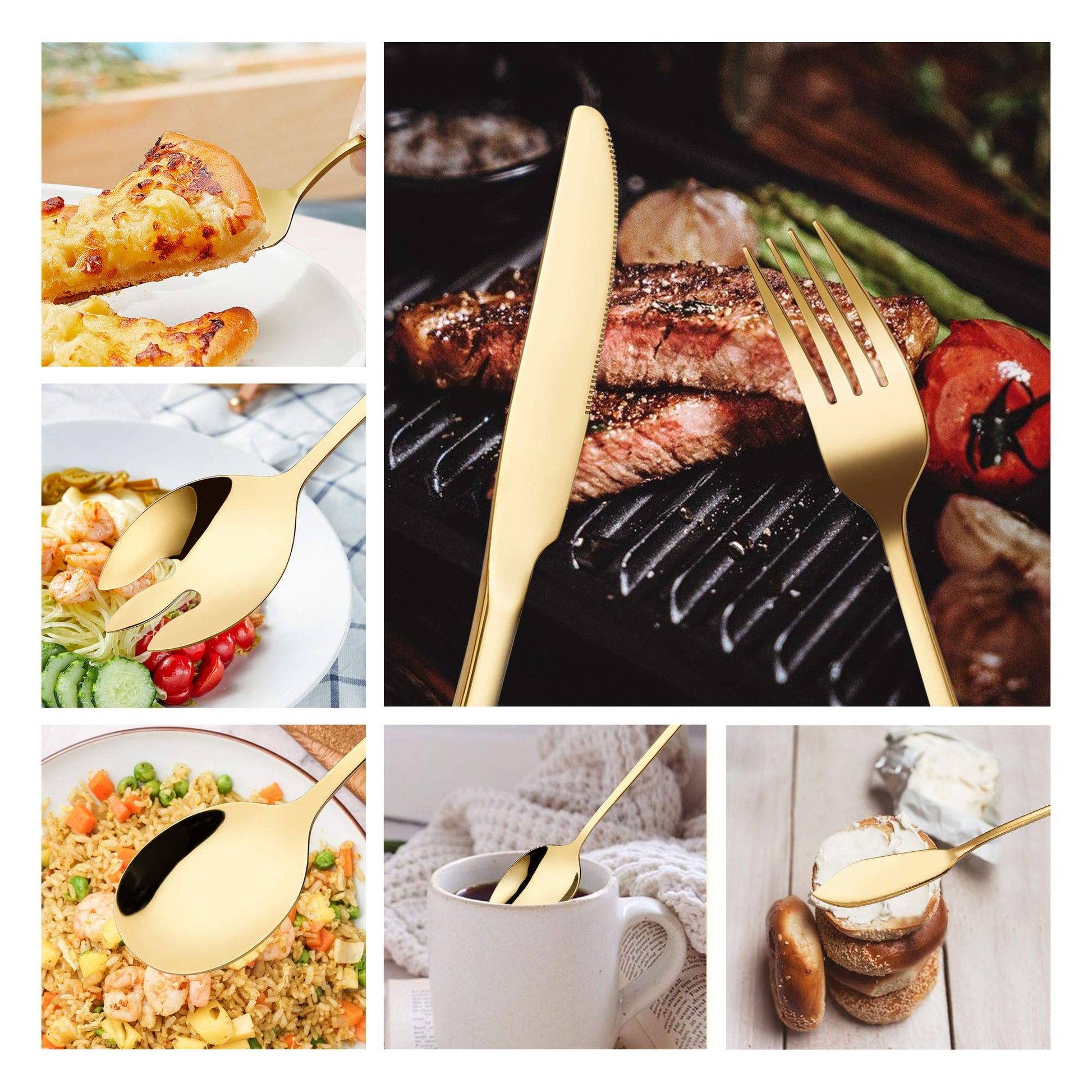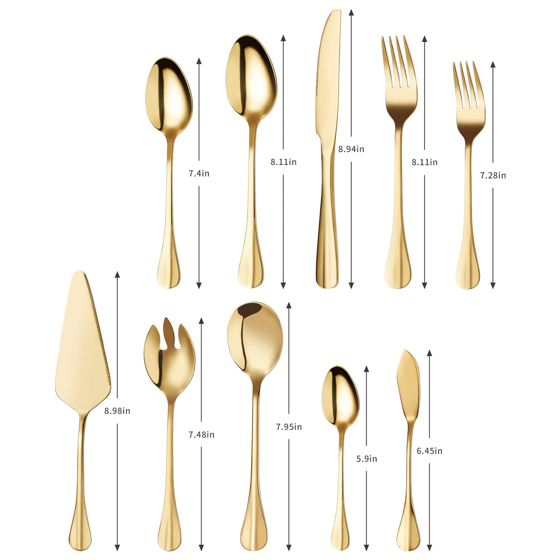 - GOLD FLATWARE SET for 8, 40 piece flatware set includes 8 place forks, 8 salad forks, 8 place spoons, 8 coffee/tea spoons, and 8 place knifes, Additional 5-piece serving set, Meet the cutlery needs of your family's daily meals. packaged in a nice box, perfect gift for wedding, housewarming, thanksgiving and Christmas.