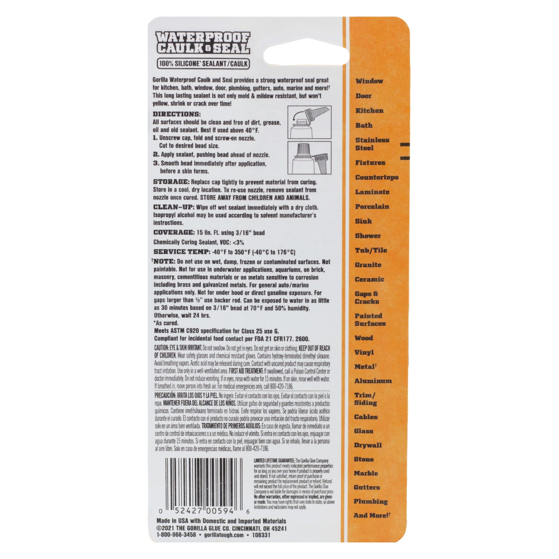 Details: Gorilla Waterproof Caulk & Seal 100% Silicone Sealant* seals out water, air and moisture and is great for kitchen, bath, window, doors, auto, marine plumbing, gutters and more! Ready for water exposure in just 30 minutes, this long lasting sealant is not only mold & mildew resistant, but won't yellow, shrink or crack over time! *as cured