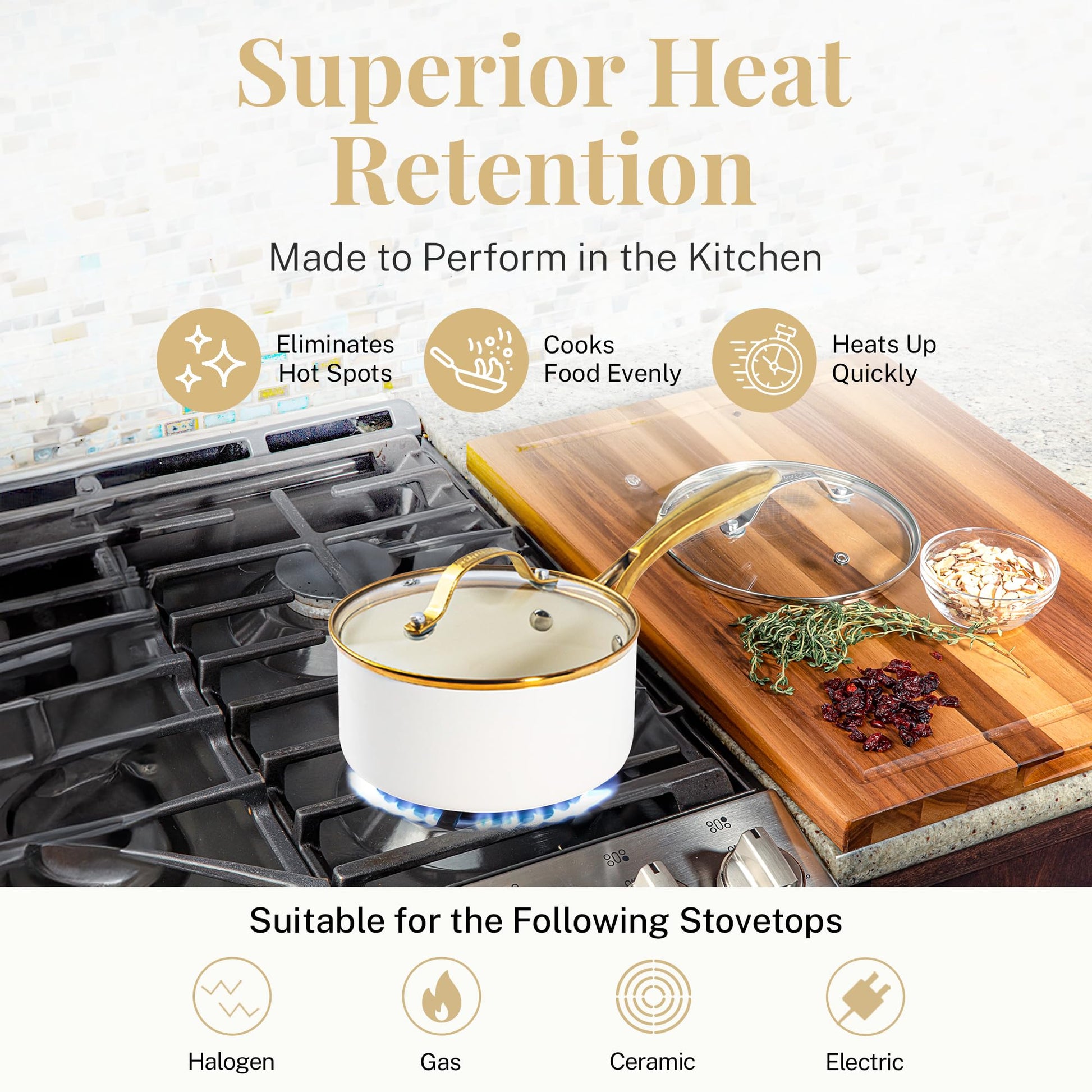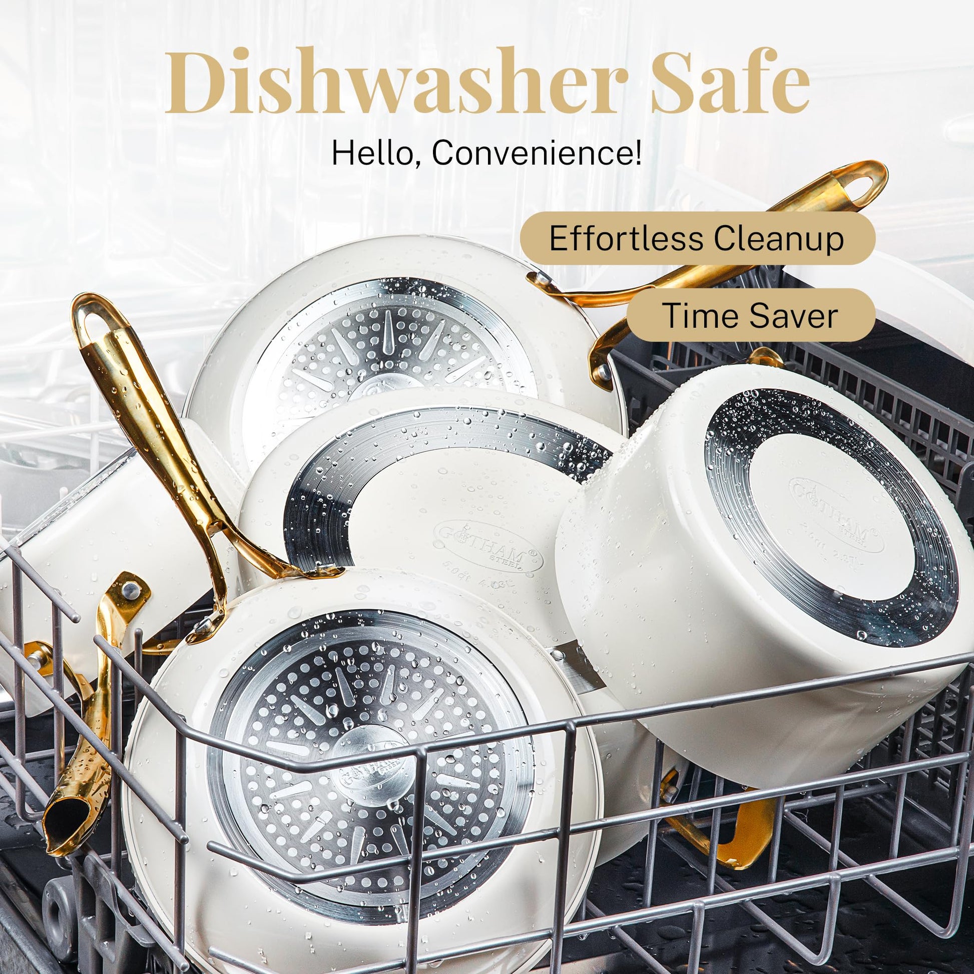 - GOTHAM STEEL NATURAL COLLECTION: Healthier cooking is easy with this nonstick ceramic cookware set. Pots and pans are designed to be 2x more durable, dishwasher safe, and oven safe up to 500˚F. Gold stay-cool handles allow you to go from stovetop to oven. But this set doesn’t just cook good, they look good too, with a modern cream color that adds an elevated aesthetic to your kitchen.