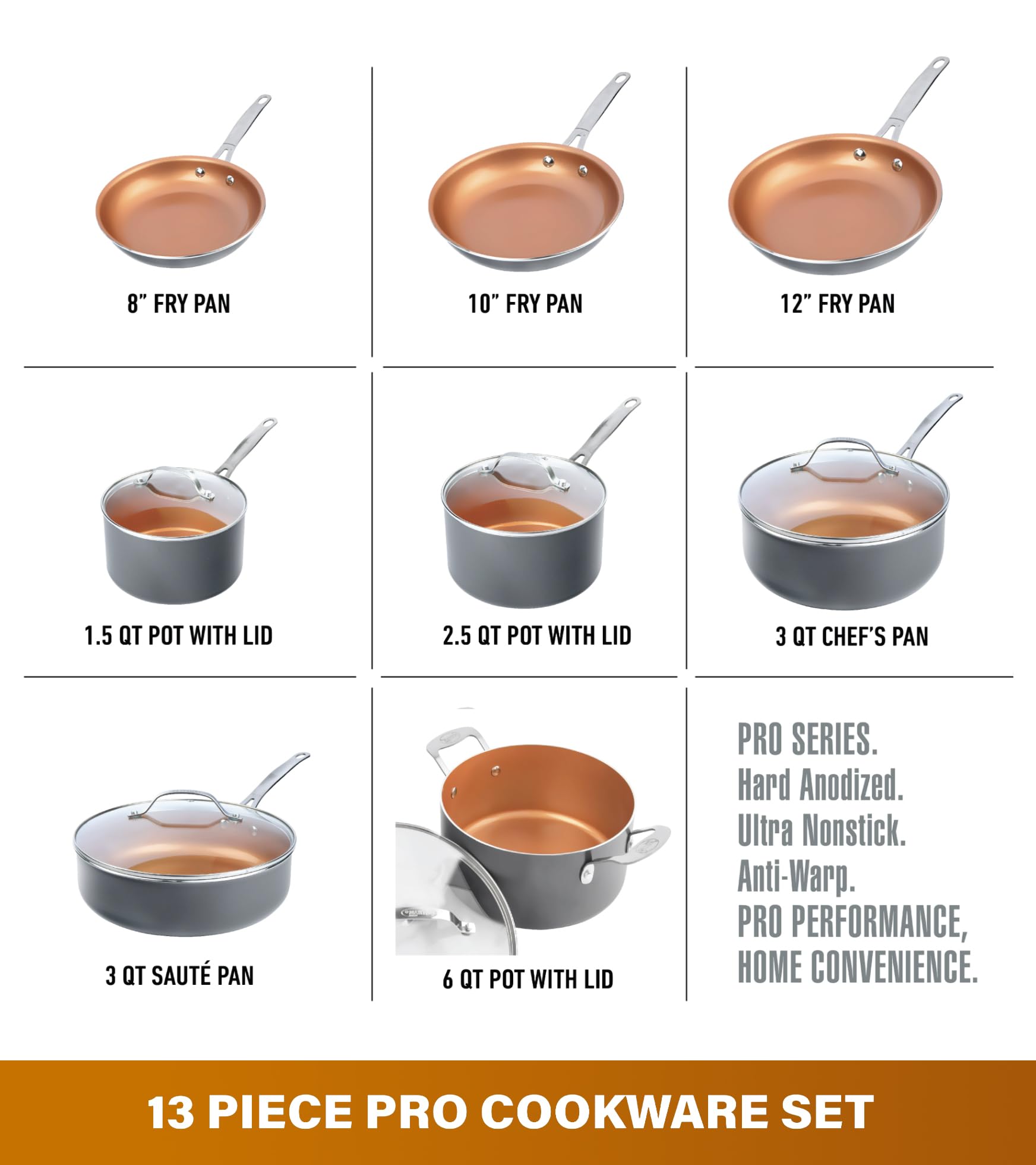 Set Includes: 8” skillet, 10” fry pan, 12. 5” fry pan, 1. 5-quart sauce pan with lid, 2. 5-quart sauce pan with lid, 3-quart chef’s pan with lid, 3-quart sauté pan with lid, 6-quart stock pot with lid