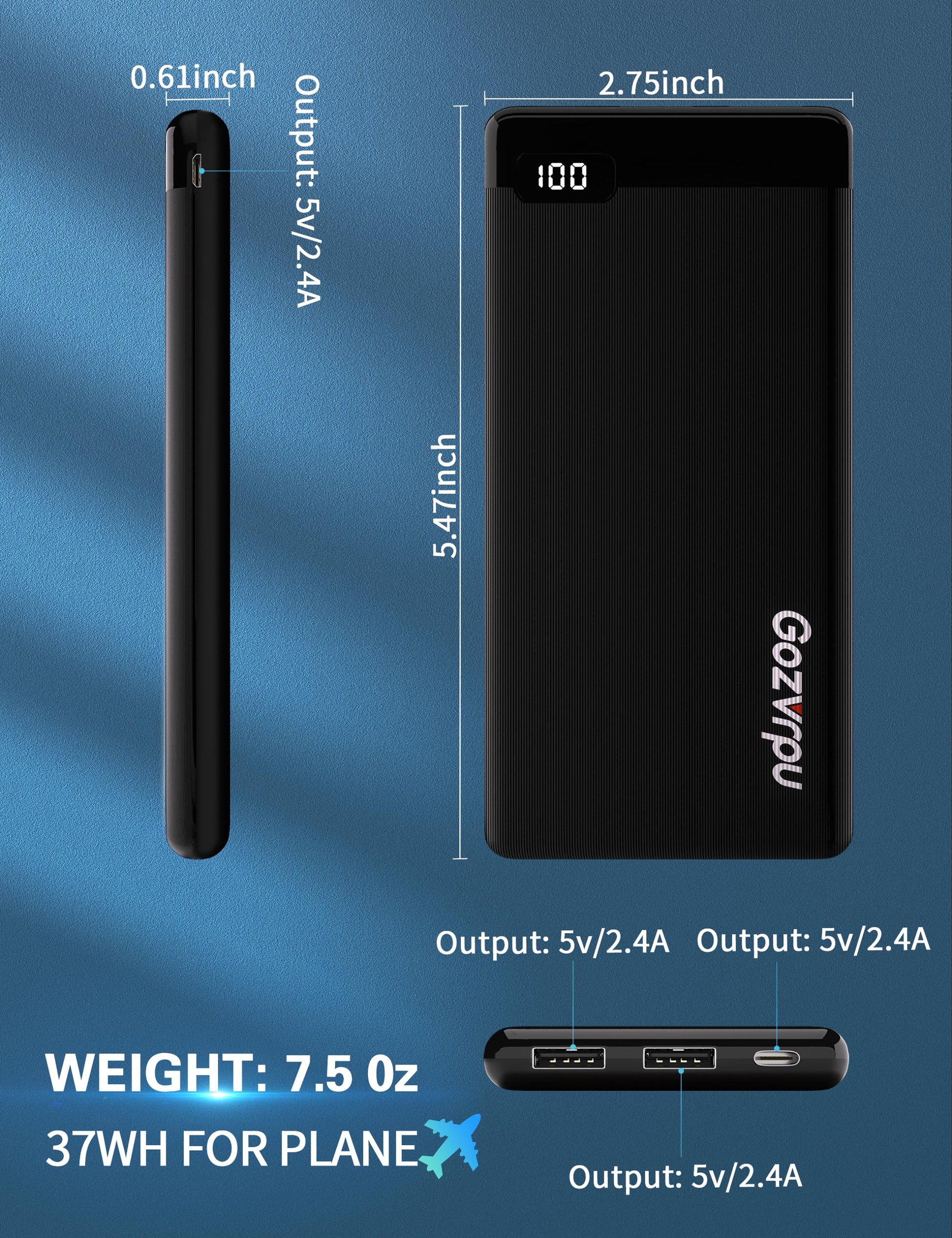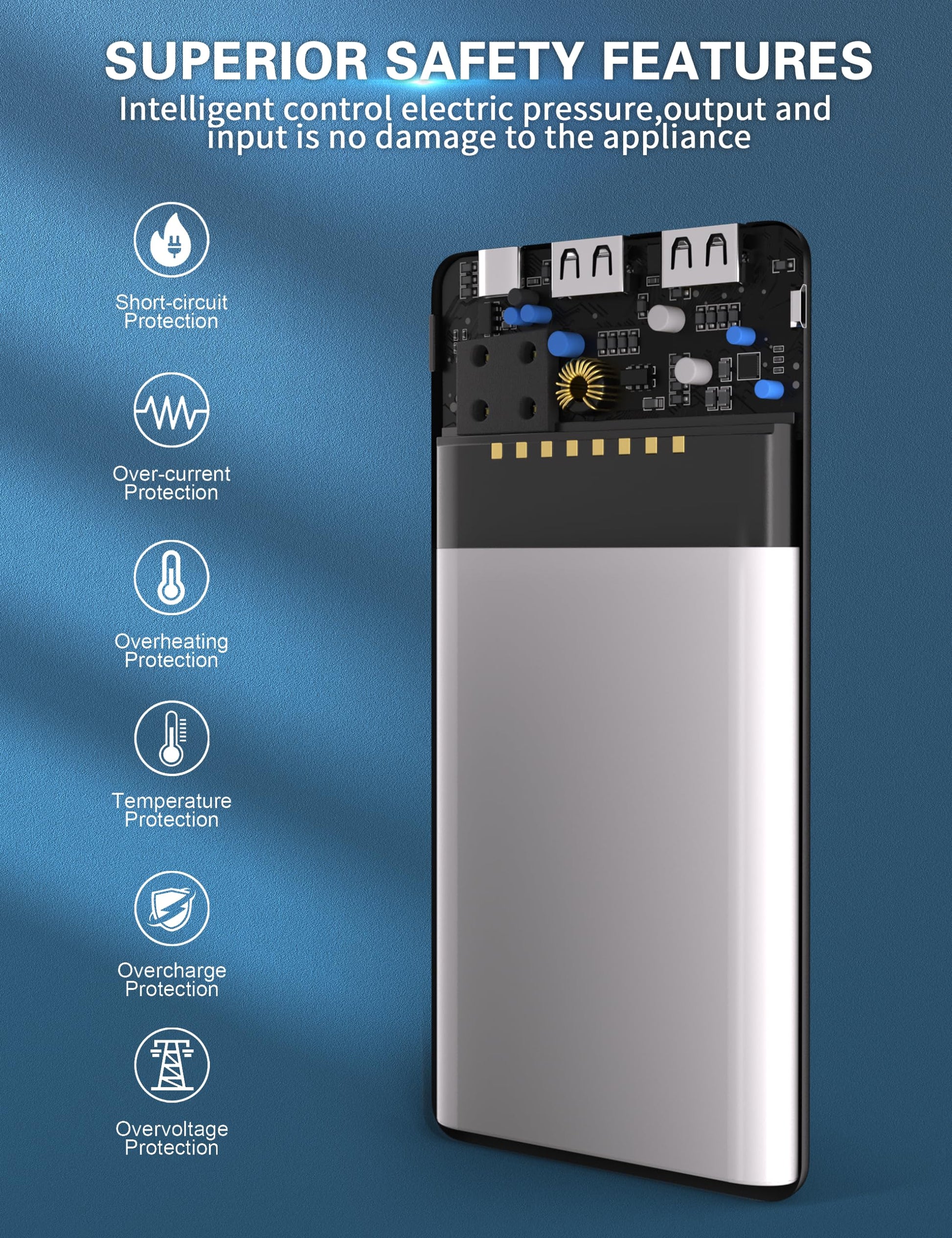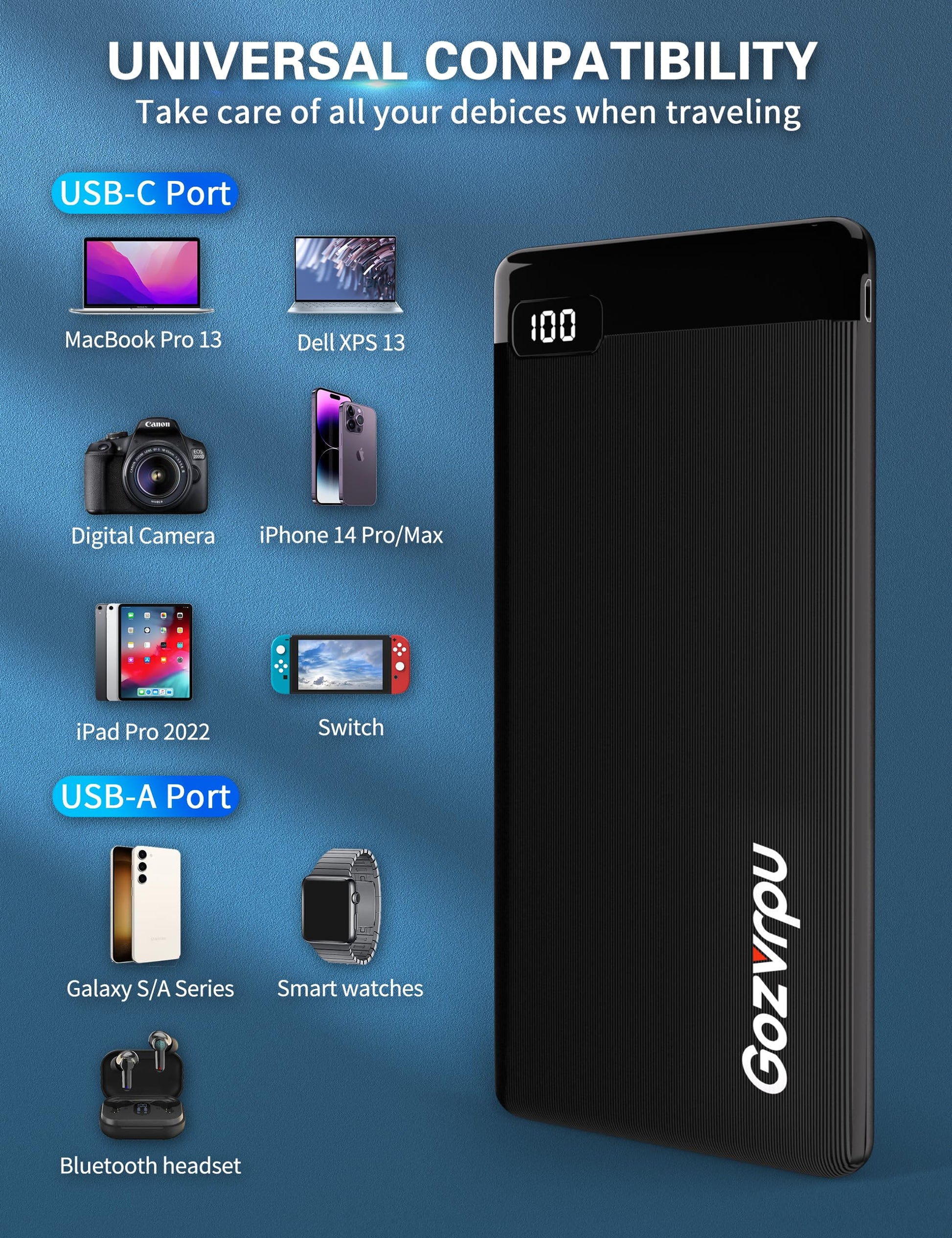 - COMPACT & SUPER LIGHTWEIGHT – Our power bank is very slim and the size of a typical smartphone, making it small and light enough to carry in a pocket or a purse. The matte textured finish makes it scratch resistant from bumps on hard surfaces, hides fingerprints and smudges, and provides a secure grip in your hands.